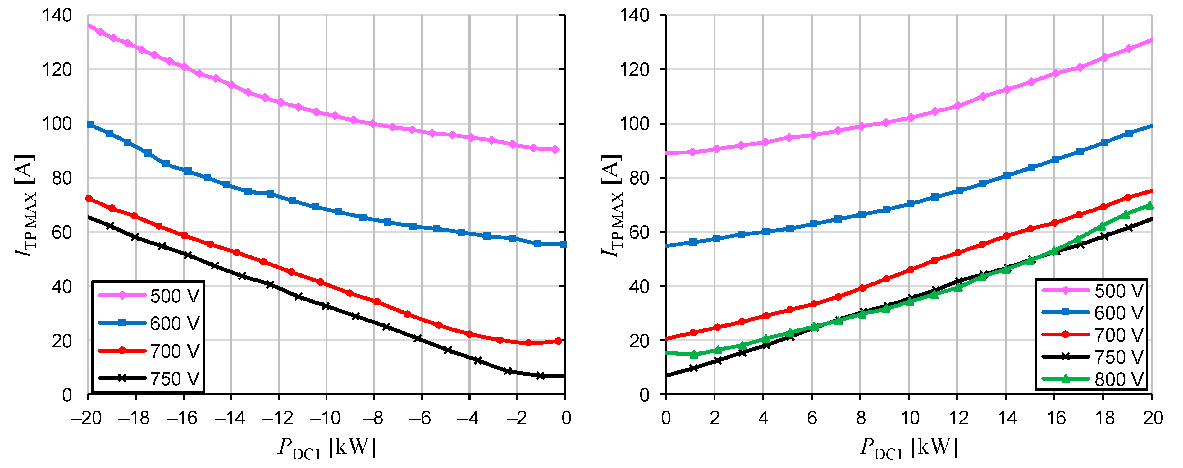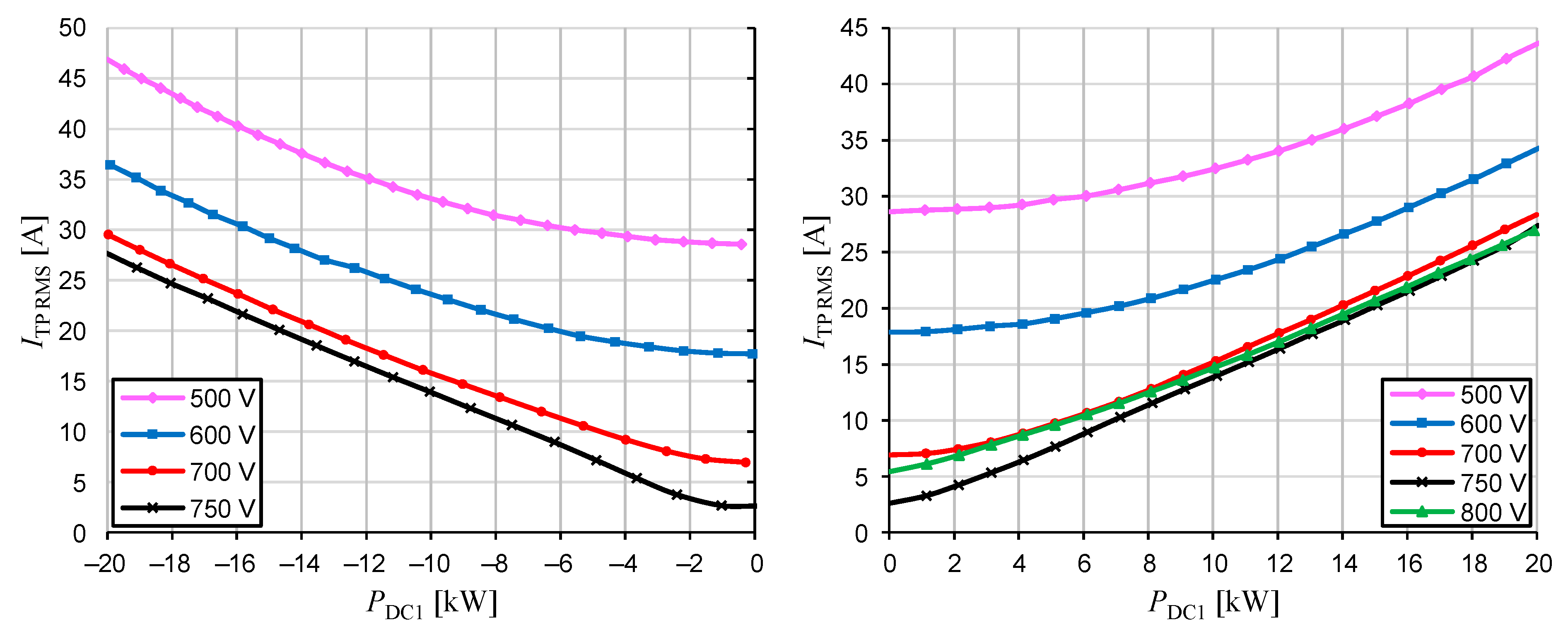 Figure 19 present the characteristics of the HF transformer primary current, both the RMS and peak, as a function of DC1 port load for various voltages at this port. The lowest current values are observed when the