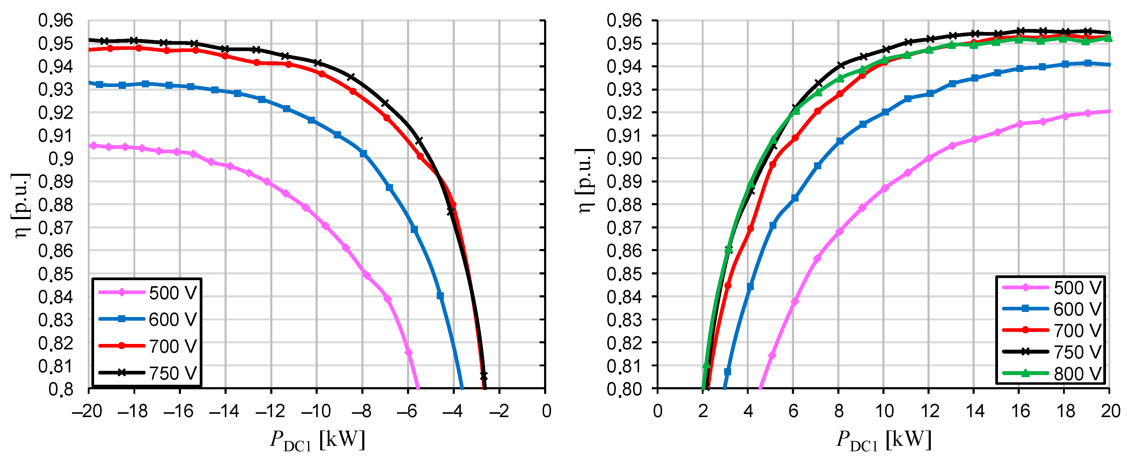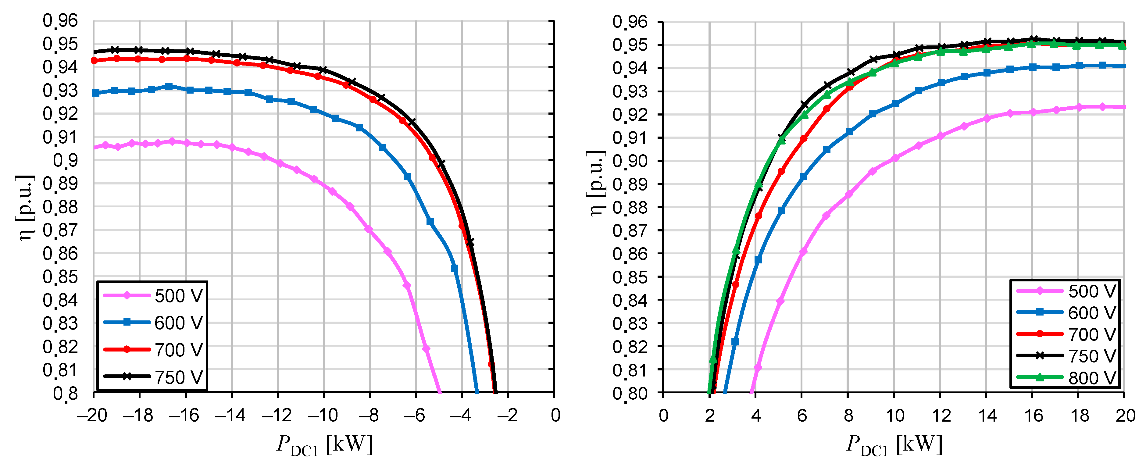 The effect of the DC1 port voltage on the operation of the DAM converter is also clearly seen from the converter efficiency characteristics shown in
