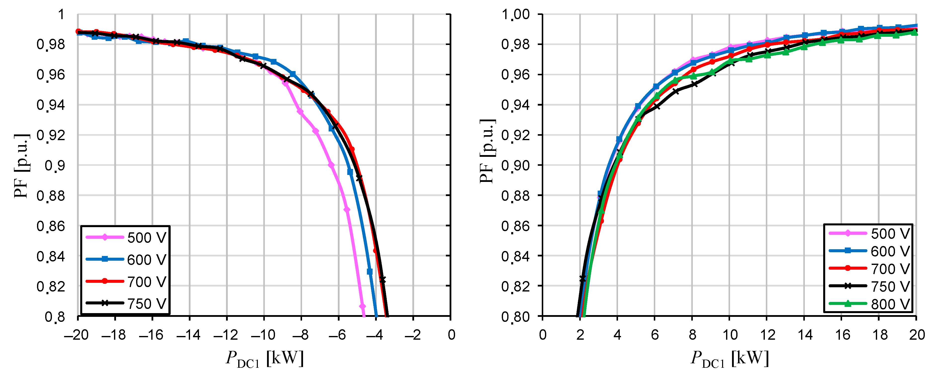 The input (grid-side) power factor (PF) of the DAM converter is independent of the power flow direction and of the DC1 port voltage, as shown in