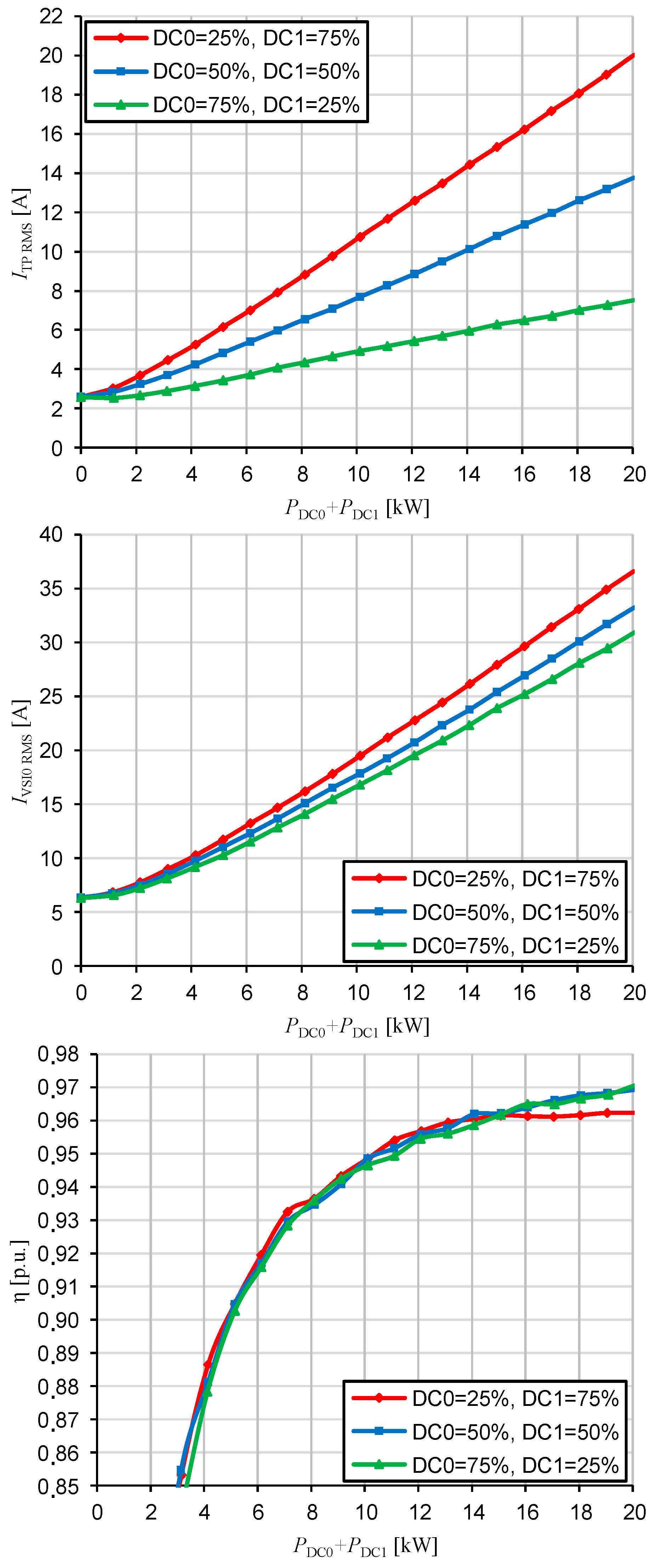 Figure 22) also clearly show that the proposed system performs optimally when the total DC load power of the additional converter modules (DC1) does not exceed the DC load power of the grid converter (DC0).