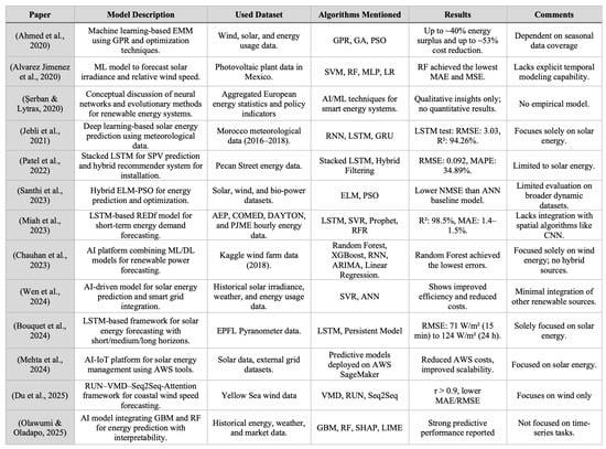 The reviewed papers [4,5,6,7,8,9,10,11,12,13,14,15,16] exhibit notable differences in scope and modeling choices. This paper [4] proposes a GPR-based energy-management model for smart grids that jointly considers wind, solar, and load data, whereas paper [5] uses classical ML (SVM, RF, MLP, LR) to forecast solar irradiance and relative wind speed for a single PV plant. Paper [6] provides a high-level AI framework for smart renewable-energy infrastructures in Europe, focusing on conceptual indicators rather than empirical models. Several studies concentrate exclusively on solar prediction using deep learning, including RNN/LSTM/GRU models on Moroccan meteorological data [7], a stacked LSTM with a hybrid recommender for SPV installation using Pecan Street data [8], and SVR/ANN models for AI-driven solar generation and smart-grid integration [12]. Paper [13] designs an LSTM-based forecasting framework over multiple horizons using EPFL pyranometer measurements, while paper [14] focuses on an AI–IoT energy management platform deployed on AWS. Other works target broader renewable portfolios or demand includes paper [9] that employ a hybrid ELM–PSO scheme over solar, wind, and bio-power datasets, paper [10] that introduces an LSTM-based REDf model for short-term energy demand using multiple utility datasets, paper [11] that develops a cloud-based forecasting platform combining tree-based and time-series models on Kaggle wind-farm data, paper [15] that couples VMD, RUN, and Seq2Seq architectures for coastal wind-speed forecasting and paper [16] studies the GBM/RF-based predictive models for sustainability metrics with SHAP/LIME-based interpretability.