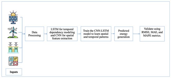 The first component illustrated in Figure 3 of the proposed framework focuses on forecasting renewable energy generation using a hybrid deep learning model that combines Convolutional Neural Networks (CNN) and Long Short-Term Memory (LSTM) units. The model was designed to capture both spatial correlations in meteorological variables and temporal dependencies in historical energy generation patterns. The input data consist of hourly records of renewable generation (solar, wind, and hydro) and corresponding weather features, including temperature, humidity, wind speed, and solar irradiance. The data are arranged as multivariate time-series windows, where each input sequence of length t (e.g., 24 h) is used to predict the next hour of generation. This 24 h window was specifically chosen to enable the model to learn from the full daily cycle of meteorological and behavioral patterns.
