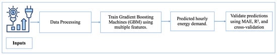 The second component presented in Figure 4 of the framework focuses on forecasting energy demand using Gradient Boosting Machines (GBMs), a tree-based ensemble learning algorithm known for its high predictive accuracy and interpretability. GBM was selected for this task due to its ability to model complex nonlinear relationships and handle heterogeneous input features efficiently, making it well-suited for energy consumption data influenced by both temporal and meteorological factors. The input features include historical electricity demand, temperature, humidity, wind speed, and time-based variables such as hour of day, day of week, and month. These were derived from the same preprocessed dataset described in Section 3.2. To capture short-term consumption dynamics, lag features and rolling averages of past demand were also incorporated. The model learns by sequentially constructing an ensemble of regression trees, where each new tree corrects the residual errors of the previous ensemble, gradually minimizing prediction loss.