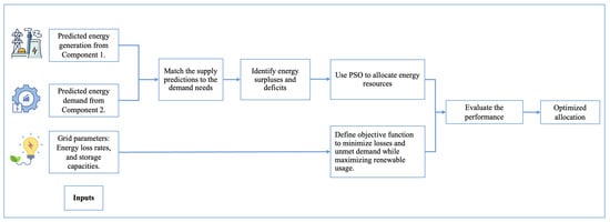 The third component shown in Figure 5 focuses on optimizing the energy allocation process using Particle Swarm Optimization (PSO), a population-based metaheuristic inspired by the collective behavior of birds and fish. PSO is applied here to efficiently allocate energy resources between renewable and conventional sources while balancing supply and demand. As a metaheuristic approach, PSO was selected for its effectiveness in navigating complex, nonlinear optimization problems, such as those involving the stochastic nature of renewables, without requiring gradient information. This provides a flexible alternative to more rigid, traditional methods like Mixed-Integer Linear Programming (MILP). Each particle in the swarm represents a candidate allocation vector , where correspond to the energy shares allocated to solar, wind, hydro, and conventional sources, respectively.