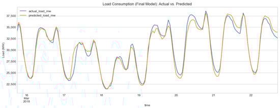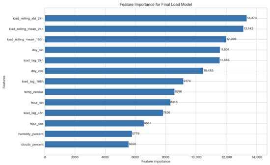 This Figure 6 shows which factors are most important in predicting energy demand. It highlights the role of past load patterns (like the 24 h and 168 h averages) and time-based features (hour of the day and day of the week). Environmental factors, such as temperature, humidity, and cloud cover, also play a key role in the predictions, helping to improve the model’s accuracy. The high importance of the 24 h (load_lag_24h) and 168 h (load_rolling_mean_168h) features is particularly noteworthy, as it empirically confirms the strong influence of daily and weekly cyclical patterns (e.g., workdays vs. weekends) on energy demand.