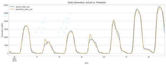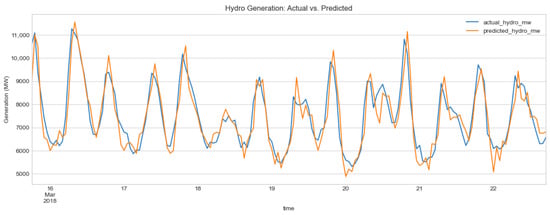 Figure 7, Figure 8, Figure 9 and Figure 10 presents a comparison of actual versus predicted (solar, wind, and hydro) power renewable generation and demand. The close alignment between both series confirms the model’s capacity to track daily fluctuations and capture both peak and off-peak variations.