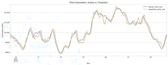 Comparison of actual and predicted wind power generation over a one-week sample. The plot highlights the model’s effectiveness in tracking the highly volatile and stochastic nature of wind energy.