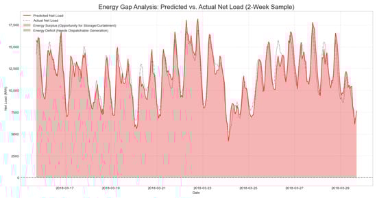 Energy Gap Analysis showing the predicted Net Load (defined as Total Demand − Total Renewable Generation) over a two-week sample. Red shaded areas indicate a predicted energy deficit, while green areas (if present) would indicate a surplus.