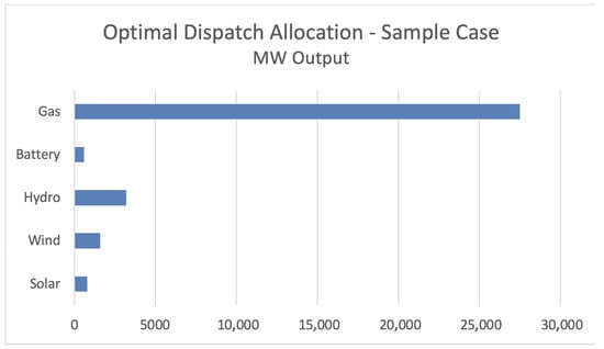 The application of PSO-based optimization led to an 18.2% reduction in operational costs and a 12% improvement in renewable utilization compared to the baseline scenario. Additionally, grid efficiency improved significantly, rising from 85% in the baseline scenario to 97% with PSO. These results demonstrate the effectiveness of the PSO framework in supporting energy management decisions, ensuring higher renewable penetration and improved grid performance. To illustrate the practical application of this allocation strategy, Figure 12 displays a sample dispatch profile during a high-demand hour.