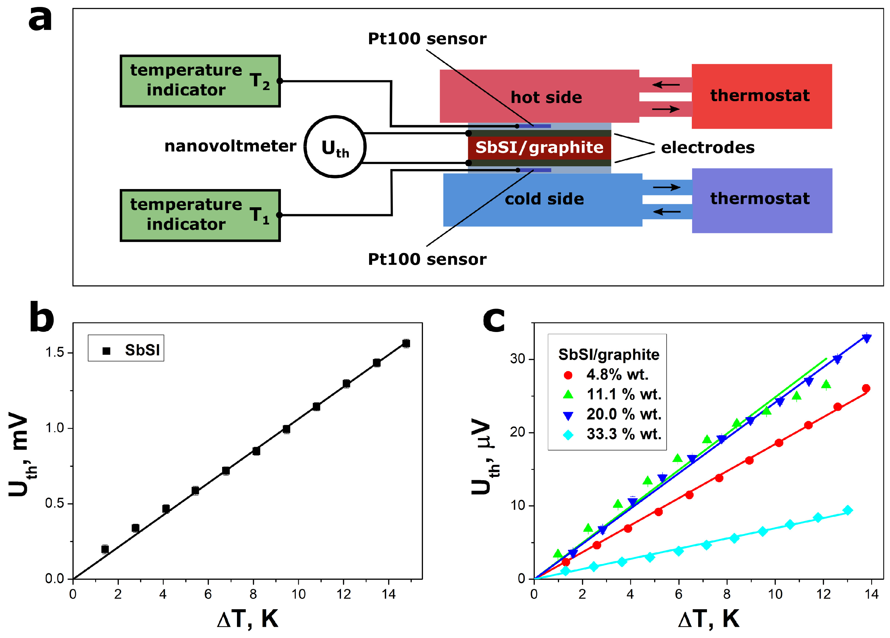 2.3. Examination of SbSI/Graphite Nanocomposite Electrical and Thermoelectric Properties