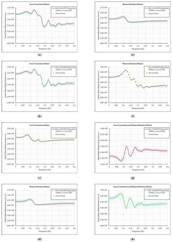 Figure 7. Comparison of the added mass in frequency between the technical report and present study; (a) Surge; (b) Sway; (c) Heave; (d) Roll; (e) Pitch; (f) Yaw; (g) Surge-Pitch; (h) Sway-Roll.