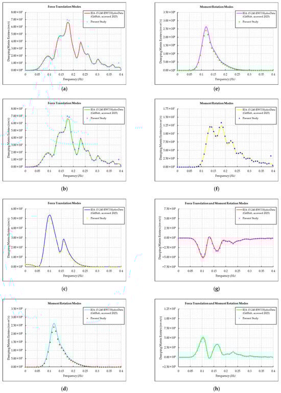 Figure 8. Comparison of the damping coefficient in frequency between the technical report and present study; (a) Surge; (b) Sway; (c) Heave; (d) Roll; (e) Pitch; (f) Yaw; (g) Surge-Pitch; (h) Sway-Roll.