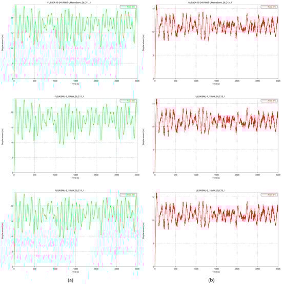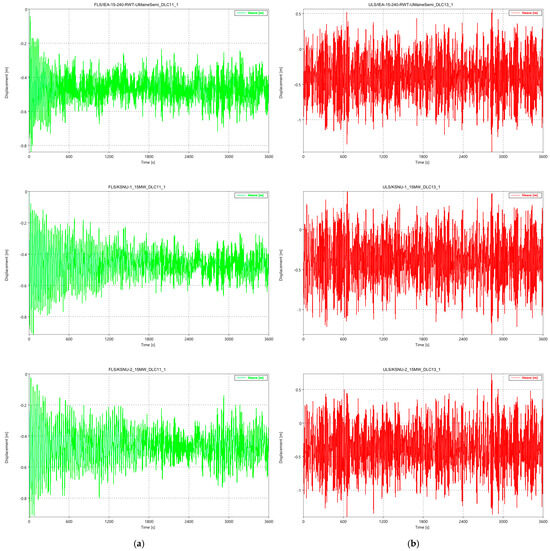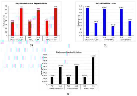 The aero-hydro-servo-elastic coupled simulation results for the KSNU 1 15 MW and KSNU 2 15 MW platforms are compared with the UMaine VolturnUS S across all six DOFs. Surge, sway, heave, roll, pitch, and yaw responses are presented in Figure 9, Figure 10, Figure 11, Figure 12, Figure 13 and Figure 14. Figure 9a, Figure 10a, Figure 11a, Figure 12a, Figure 13a and Figure 14a show the time-domain responses under the normal condition (FLS), while Figure 9b, Figure 10b, Figure 11b, Figure 12b, Figure 13b and Figure 14b show the corresponding responses under the extreme condition (ULS). The comparisons of maximum magnitude, mean displacement, and standard deviation for each motion component are summarized in Figure 9c, Figure 10c, Figure 11c, Figure 12c, Figure 13c and Figure 14c, Figure 9d, Figure 10d, Figure 11d, Figure 12d, Figure 13d and Figure 14d, and Figure 9e, Figure 10e, Figure 11e, Figure 12e, Figure 13e and Figure 14e, respectively.