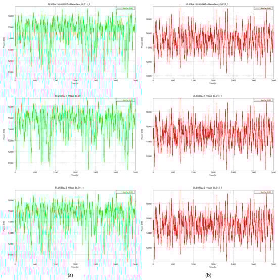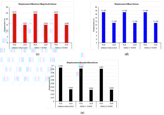 Figure 15. OpenFAST coupled simulation results for generated power; (a) Time history under FLS; (b) Time his-tory under ULS, (c) Comparison of maximum displacement values; (d) Comparison of mean displacement values; (e) Comparison of displacement standard deviations for the UMaine VolturnUS-S, KSNU-1 15 MW, and KSNU-2 15 MW platforms.