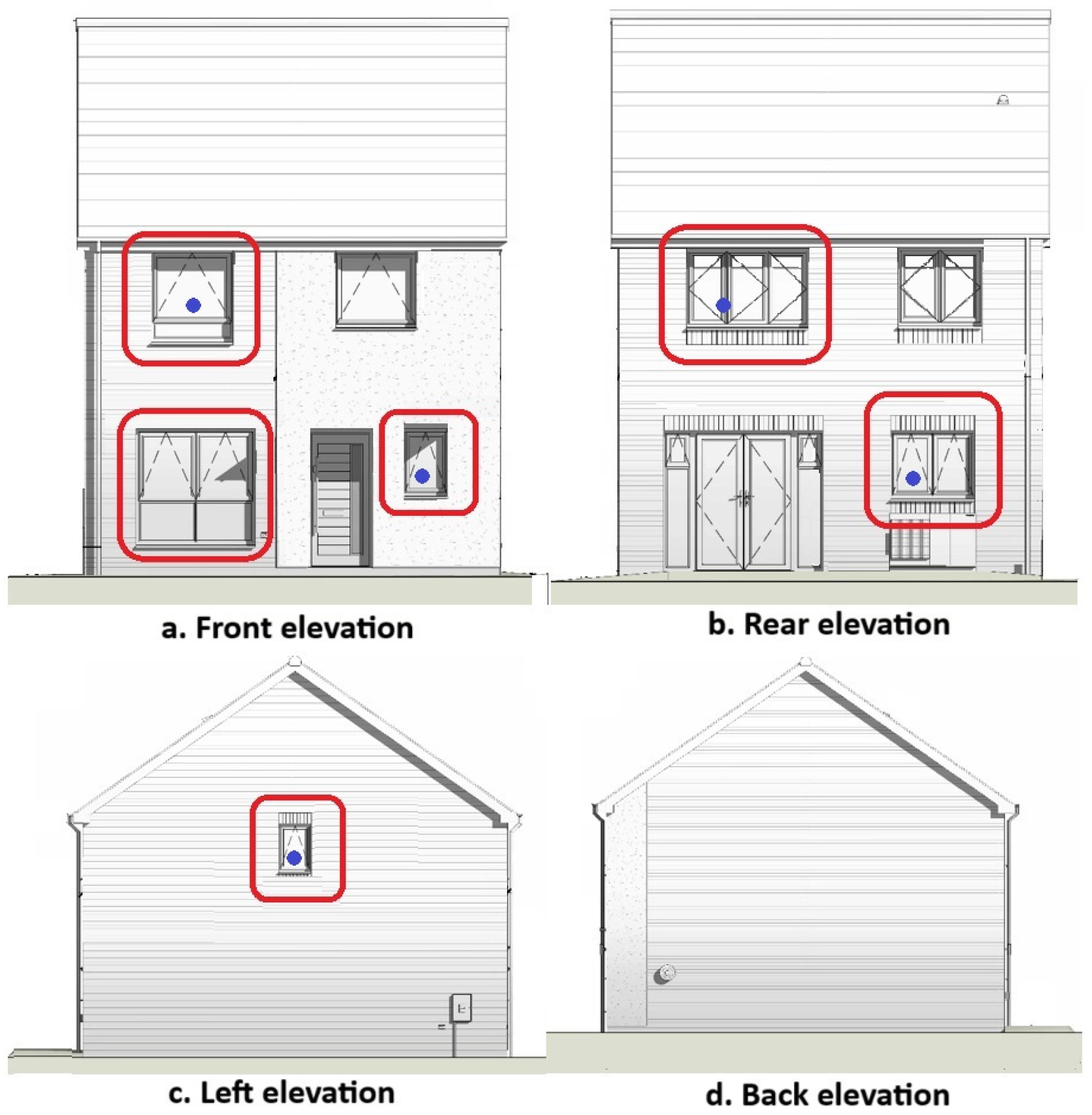 TFH contains a total of eight windows—three on the ground floor and five on the first floor. For this experiment, six windows were selected: three on the ground floor and three on the first floor, each positioned on different façades to create a vertical airflow path through the building. The windows were selected to maintain comparable airflow characteristics between the two levels and to form a balanced stack-driven ventilation configuration, with the ground-floor openings acting as inlets and the first-floor openings acting as outlets. The remaining two windows were excluded to preserve this balanced inlet–outlet arrangement and to remain consistent with the six-channel velocity measurement setup available for the experiment. The locations of the selected openings are shown in