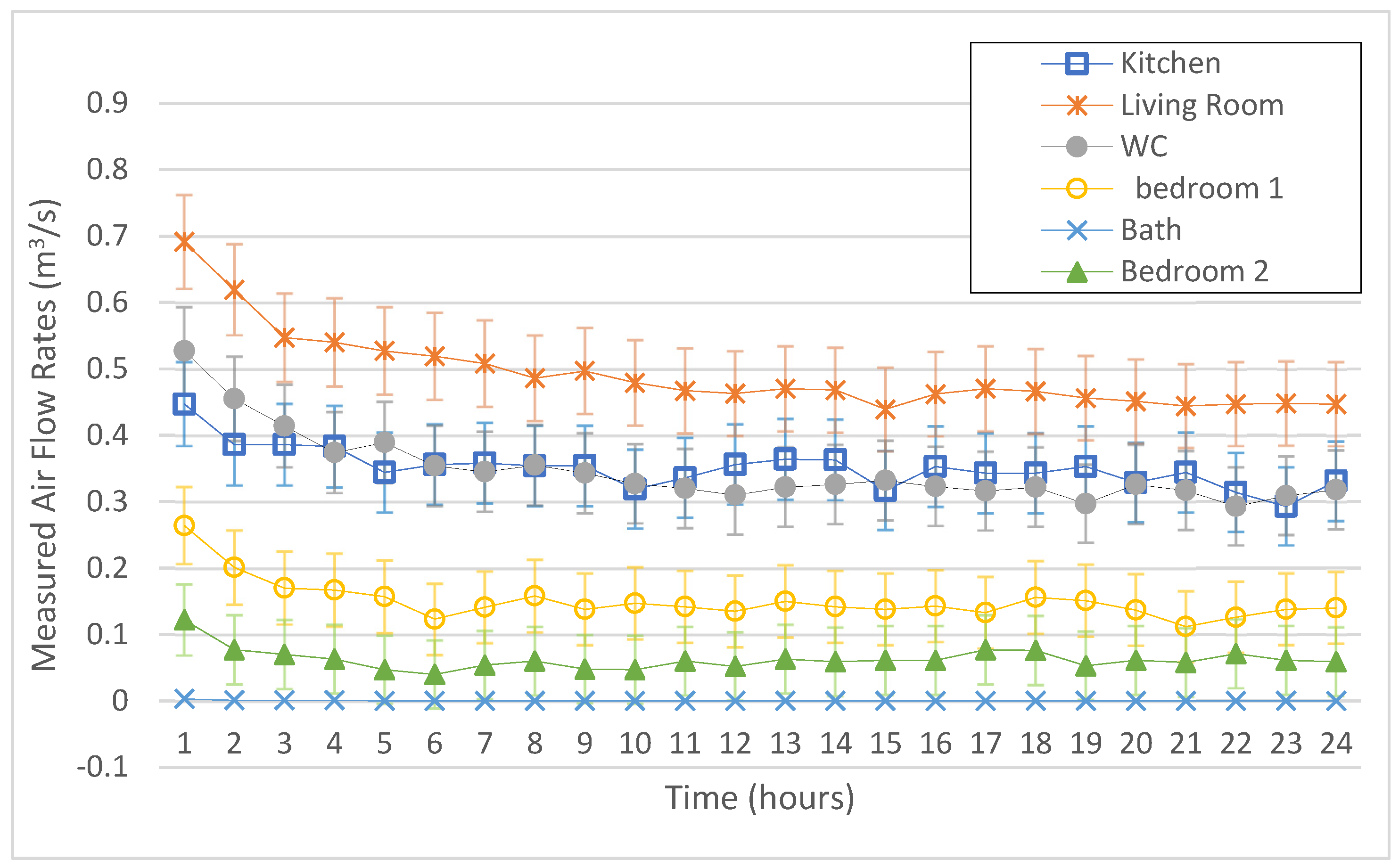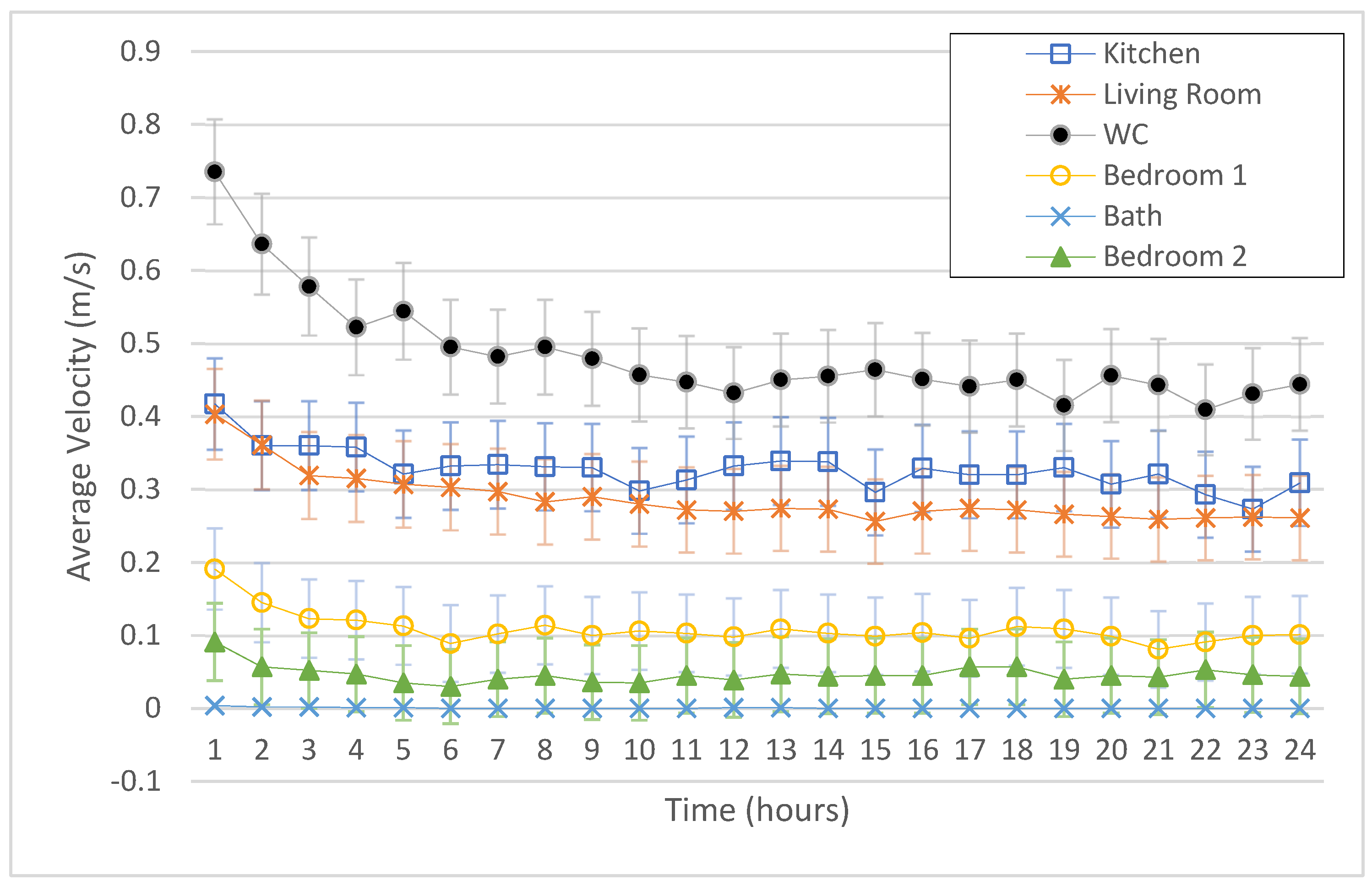 At the individual opening level, the WC window consistently exhibited the highest velocities, starting at approximately 0.7 m/s before stabilizing between 0.4 m/s and 0.5 m/s. The kitchen and living room followed similar patterns, both settling around 0.25–0.35 m/s after the initial decline.