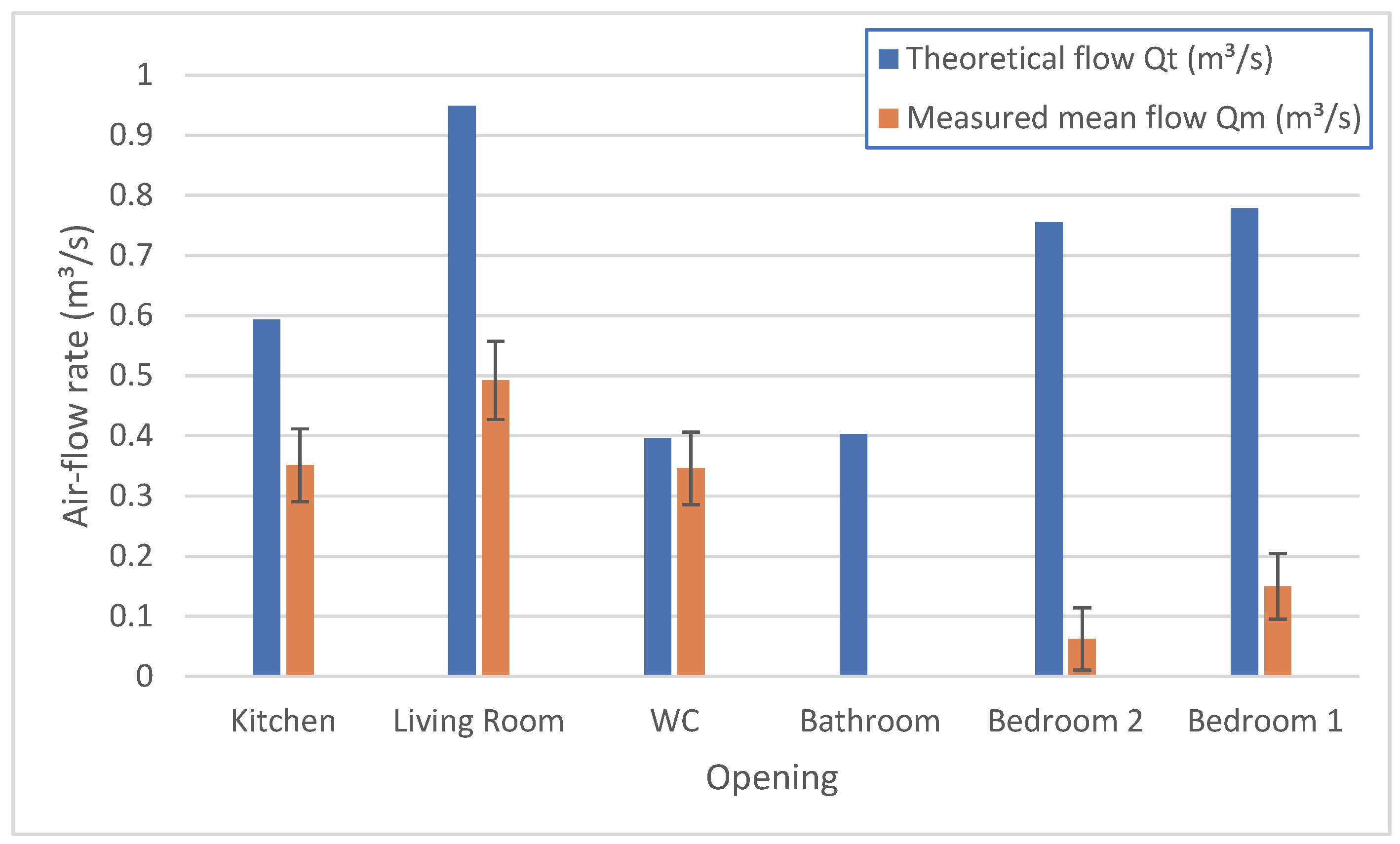 The comparison between theoretical and measured airflow rates revealed consistent differences across all monitored openings. As shown in