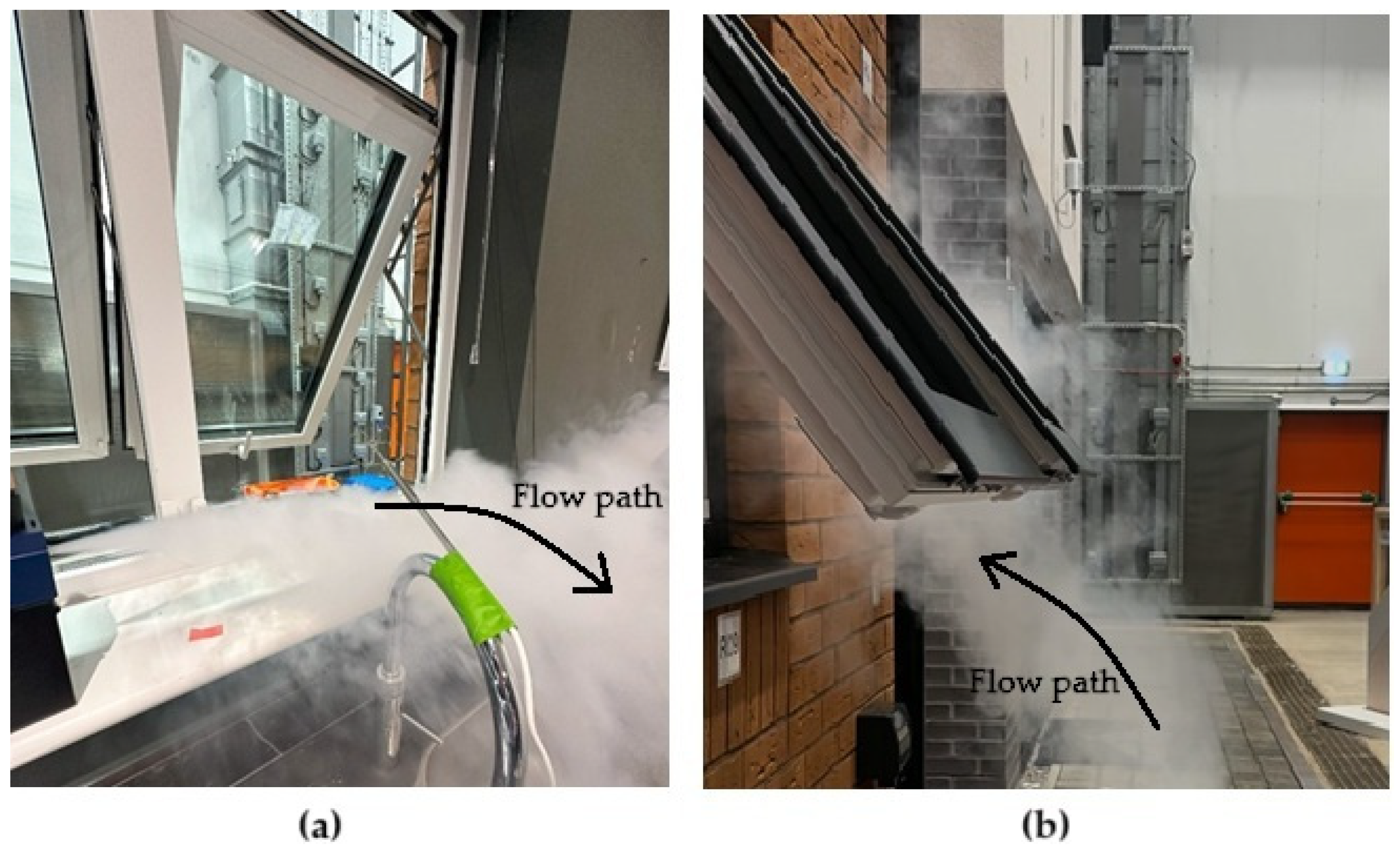Figure A1. For the top-hung windows, the probe was positioned approximately near the centroid of the dominant flow region, where airflow was expected to be most representative, based on preliminary smoke visualization. To maintain consistency across all measurements, the same vertical probe height (0.16 m above the sill) was also applied to the non-top-hung window, even though an alternative placement could have been considered. This approach was adopted to ensure comparability between openings and to avoid introducing additional variability due to probe positioning. The single-probe strategy was selected primarily due to practical constraints, including the limited number of available sensors and the cost associated with deploying multiple probes per opening. The implications of this limitation, including its expected influence on the inflow–outflow balance, are considered in the uncertainty analysis and further discussed in