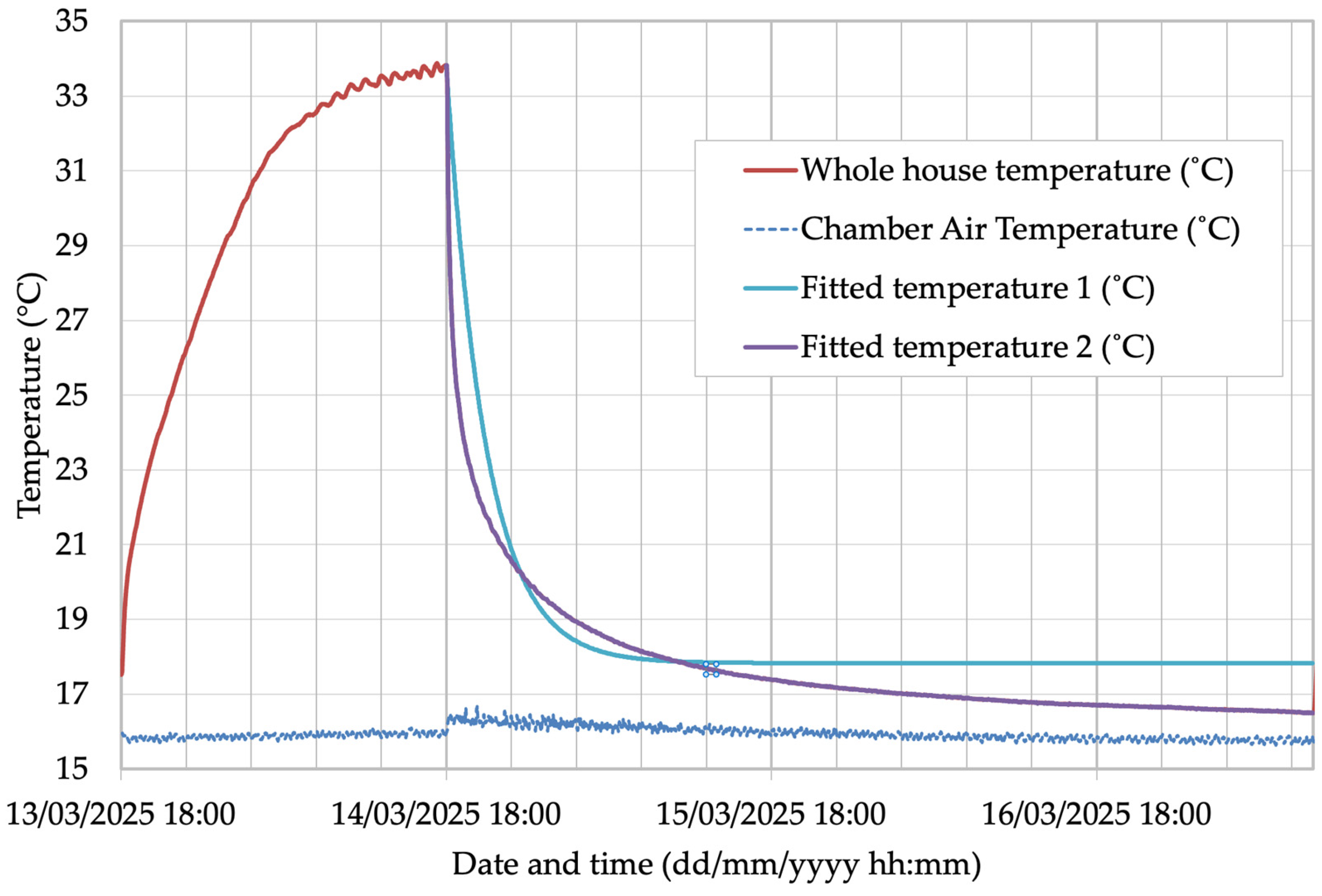 In this phase of the test, the internal temperature was set to circa 33 °C, and the outside (chamber) temperature was set to 16 °C. At the start of the test, internal heaters were switched off, and all windows were opened simultaneously. A mid-point room air temperature was recorded in each room, and an area-weighted whole house temperature was calculated as follows: