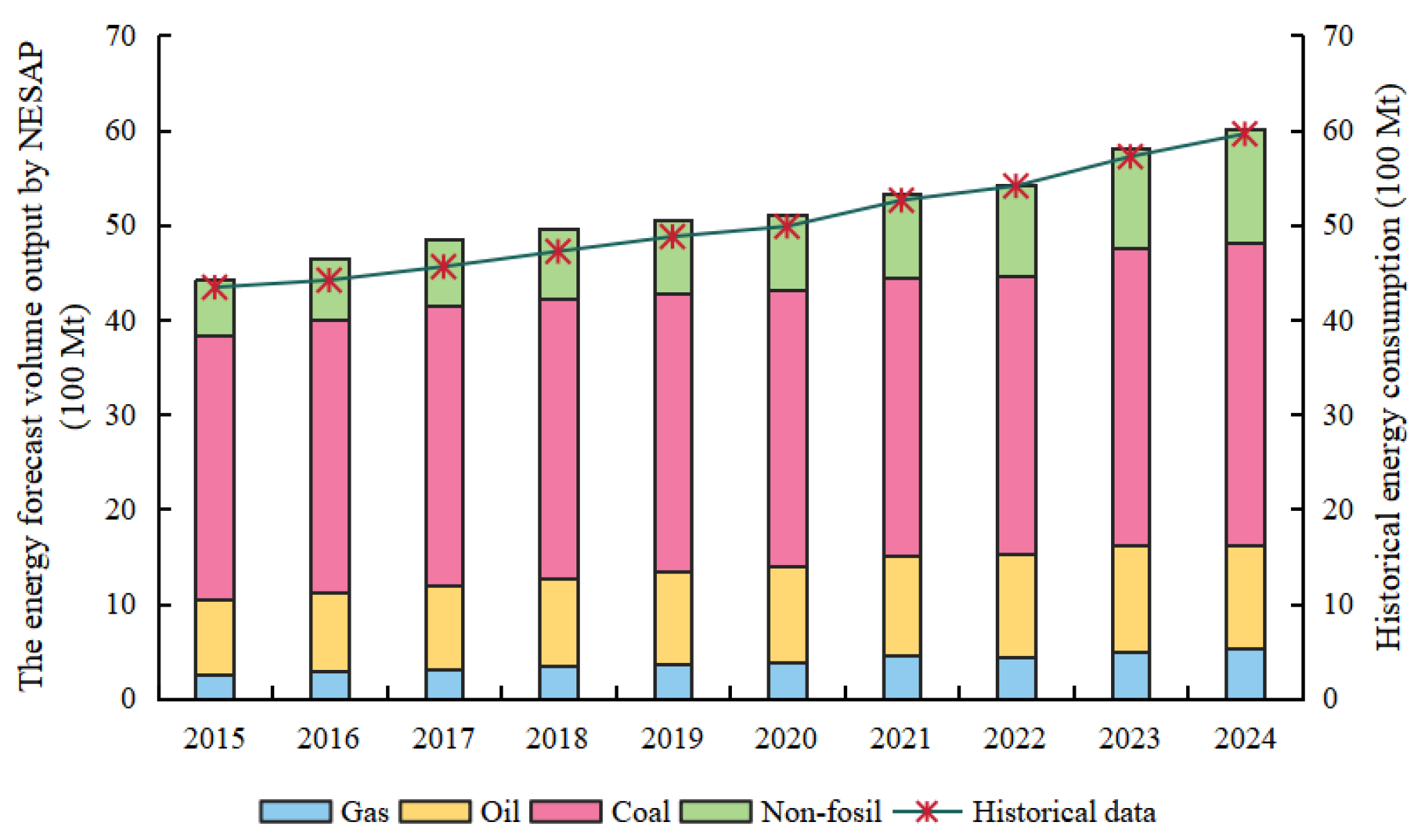 The NESAP model adopts an annual temporal resolution for the study period, with key transition periods highlighted for scenario analysis. This temporal setup balances computational efficiency and analytical precision. Key parameters and model outputs were calibrated using historical data from 2015 to 2019, with relative errors controlled within ±5%. The specific framework of this model is presented in