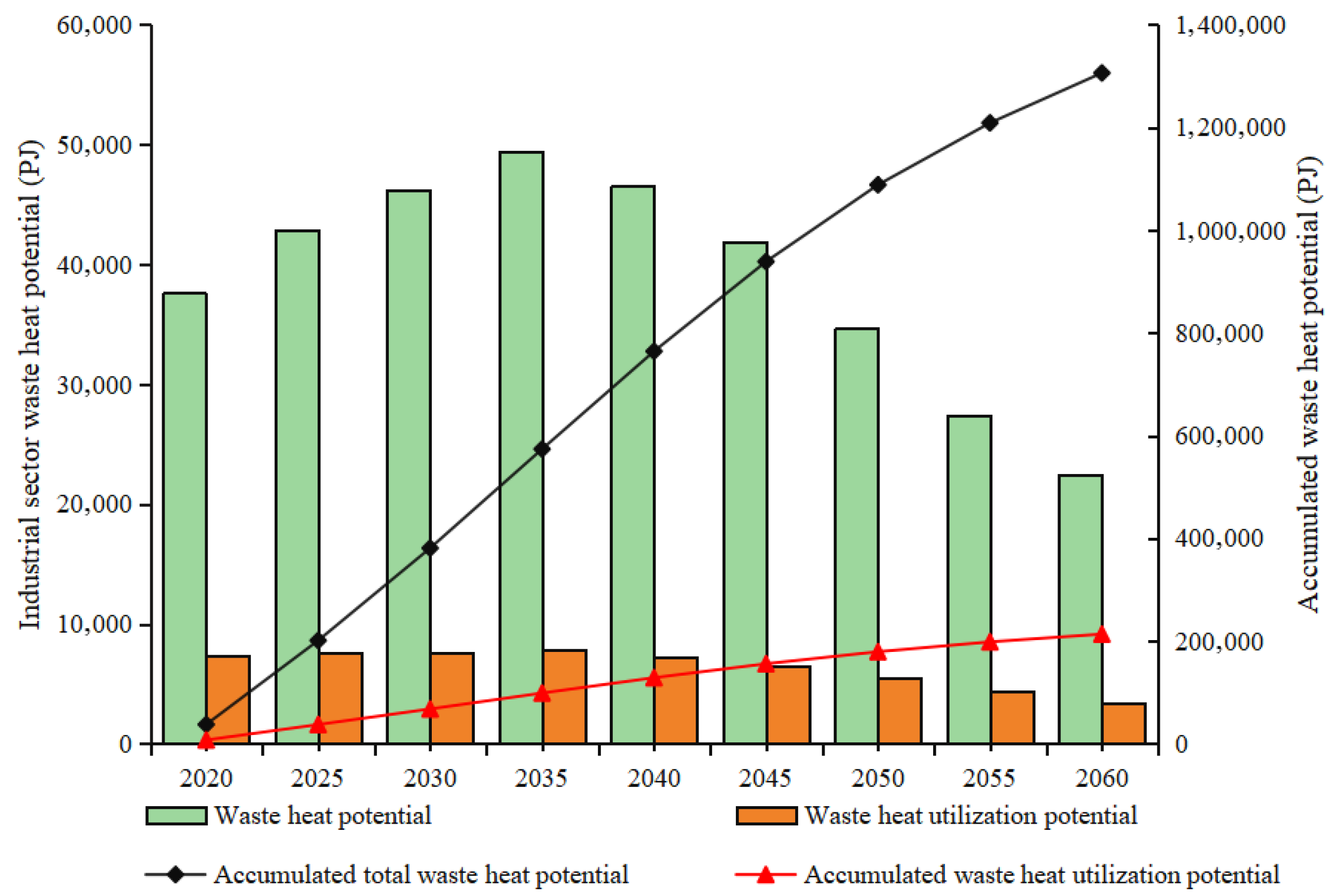 Figure 4. Derived from the above estimates, we find that the total waste heat potential of China’s industrial sector is projected to exhibit an inverted U-shaped temporal trend. Specifically, due to the rigid energy consumption growth in the industrial sector, the total waste heat potential will sustain a relatively stable growth rate during 2020–2035. The total waste heat potential is expected to reach 49,401 Petajoules (PJ) by 2035, from 37,608 PJ in 2020, with an annual growth rate of 1.8%. The turning point in the total waste heat potential pathways from 2035 is mainly due to the effective control of the primary energy consumption. By 2060, the total waste heat potential will decrease to 22,467 PJ.
