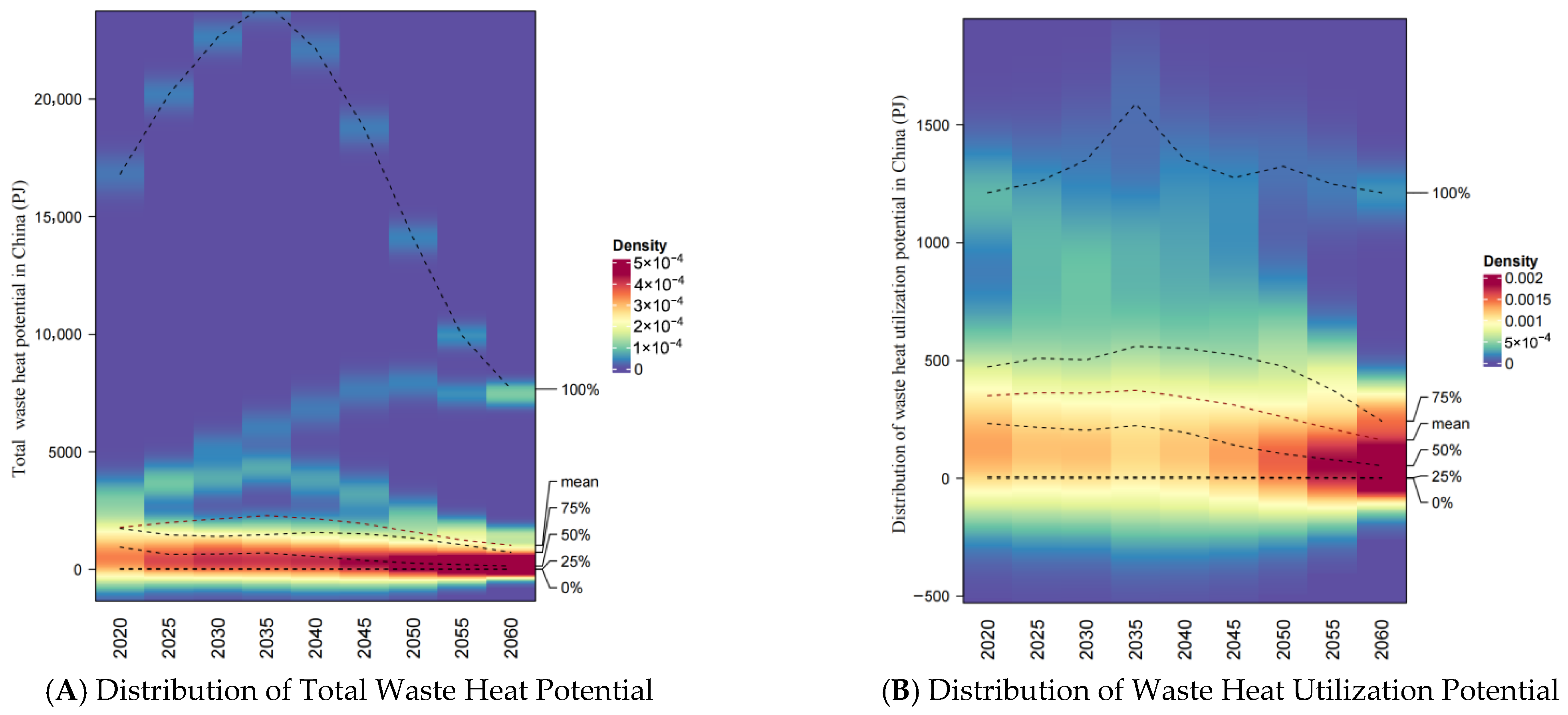 Figure 5A,B show the trend of waste heat potential distribution in the industrial sector. Each row represents the distribution of waste heat potential, and each column represents time. Red indicates a higher distribution density of the industry, light yellow indicates a medium density, and dark blue indicates a lower density. In the near and medium term, the distribution of total waste heat potential exhibits substantial heterogeneity across different sectors, with its main concentration within the range of 0–2500 Petajoules (PJ), as shown in