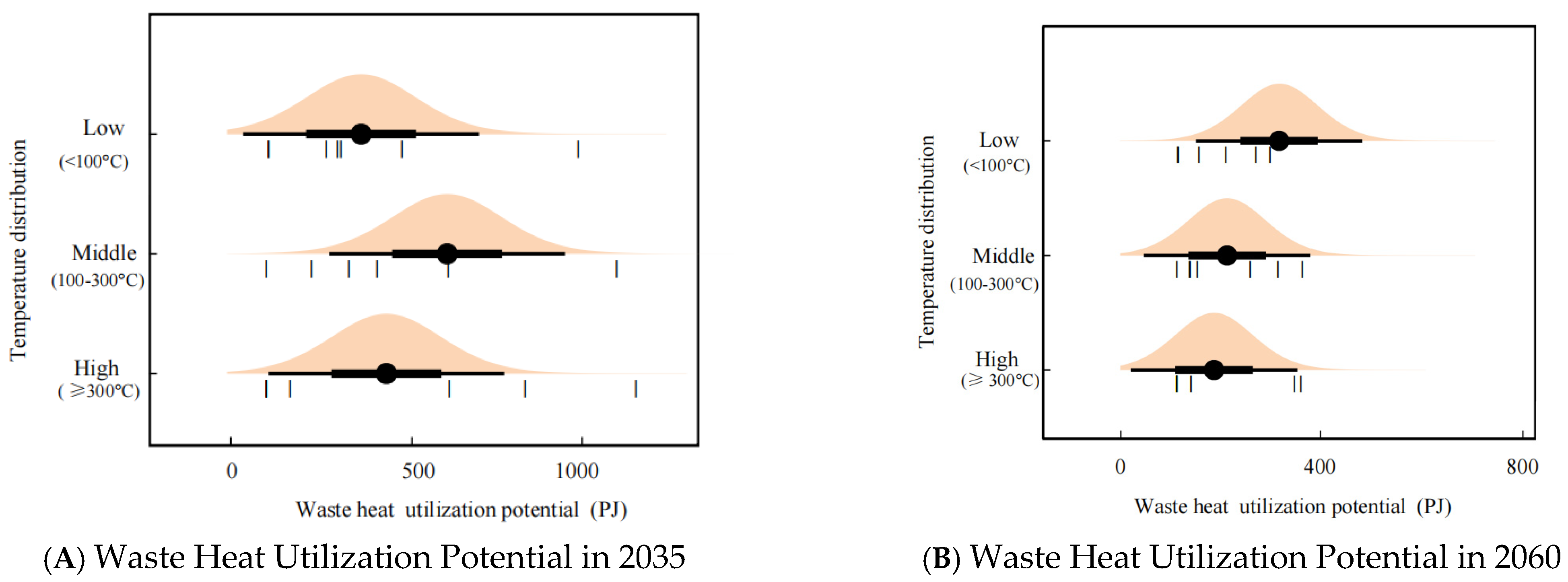 Figure 7A shows that in 2035, the waste heat utilization potentials for most industries are concentrated around 375 PJ for low-grade (<100 °C), 600 PJ for middle-grade (100–300 °C), and 400 PJ for high-grade (≥300 °C) categories. By 2060, the entire distribution curves shift leftward compared to those in 2035, as shown in
