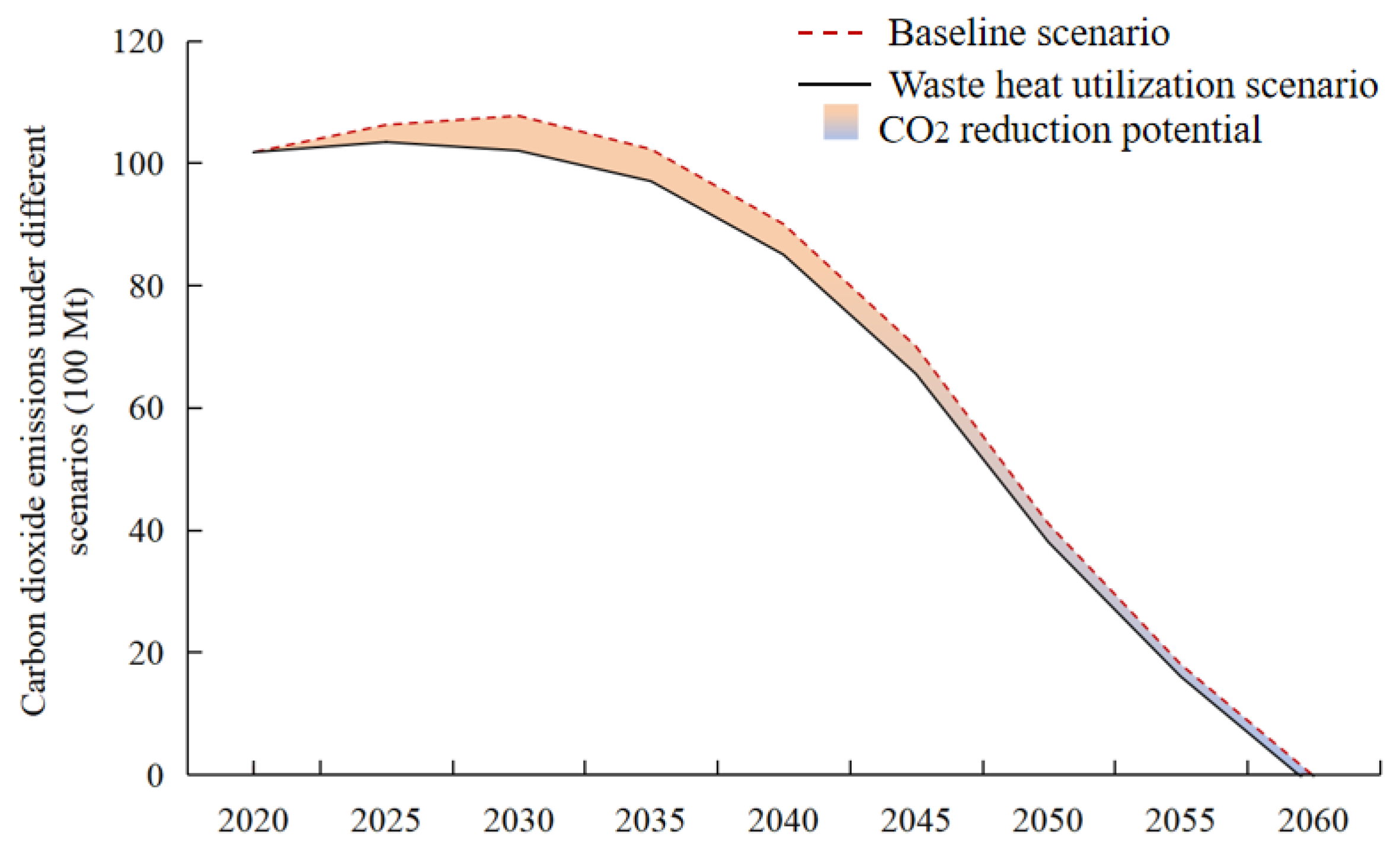 Figure 8 illustrates the development paths of carbon emissions under various scenarios. The red dashed line represents the carbon emission curve under the baseline scenario of carbon neutrality by 2060. The black solid line represents the development path of carbon emissions under the waste heat utilization scenario, and the vertical width of the shaded area reflects the emission reduction potential brought by the implementation of waste heat utilization measures. It is found that waste heat utilization has the greatest potential to reduce carbon emissions from 2025 to 2035, which can effectively lower the carbon emission peak and reduce the emission level during the plateau period.