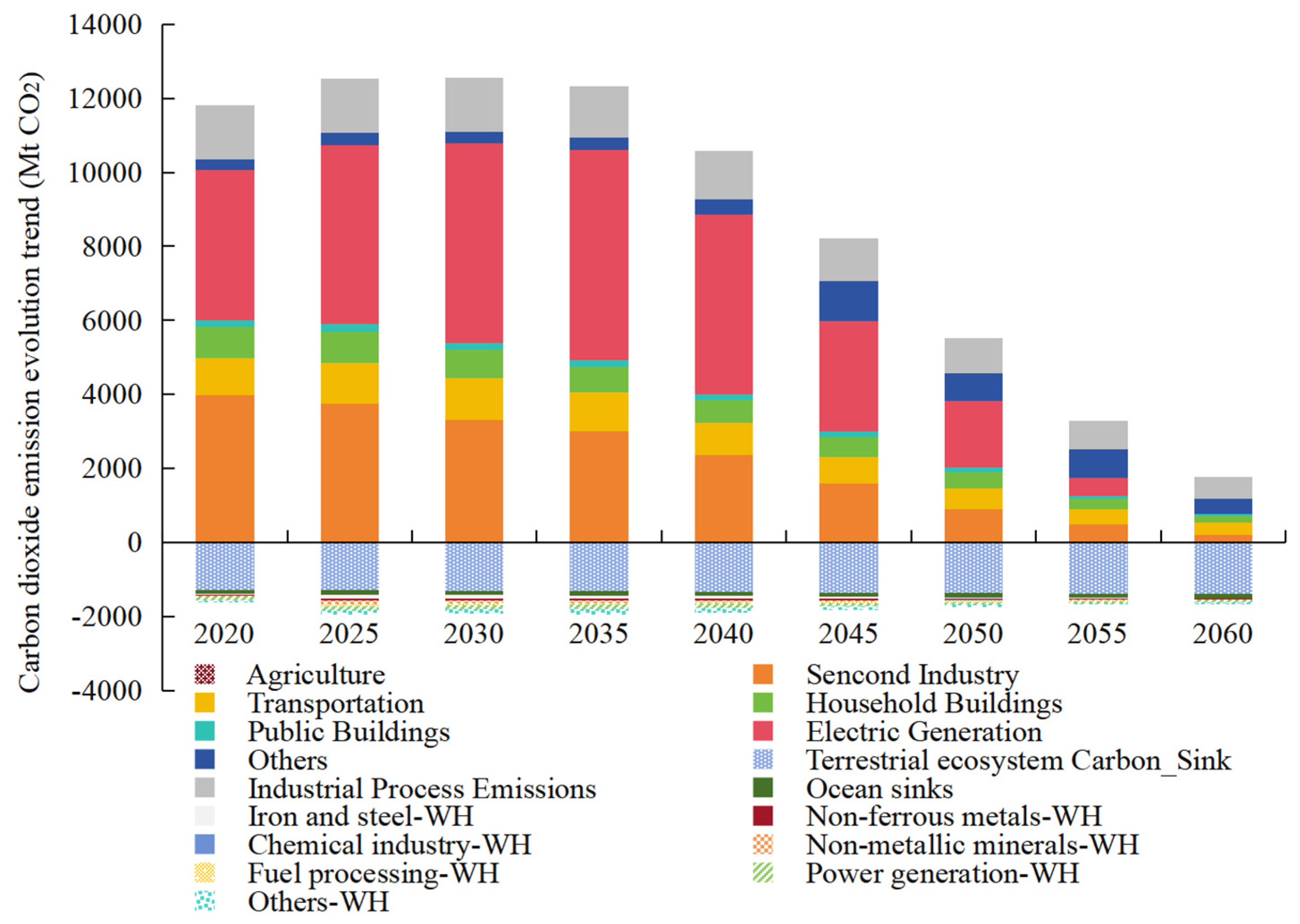 Under the baseline scenario, China’s carbon emissions will exhibit a high-level peak characteristic, expected to occur around 2030 with a peak value of approximately 10,800 million tons (Mt) of CO2. Following the peak, emissions will exhibit a steady decline, approaching near-zero levels by 2060. Under the waste heat utilization scenario, the peak level will decrease significantly, advance the peak year to around 2028, and reduce peak emissions by 5.1% relative to the baseline scenario.