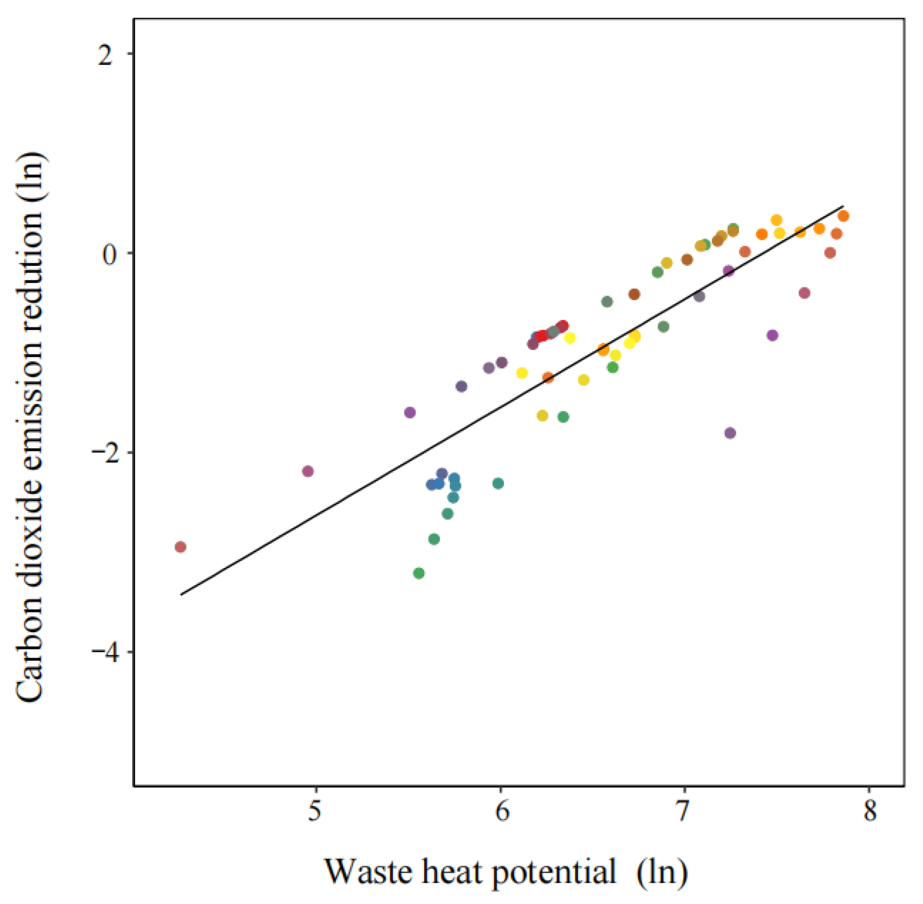 37]. To quantify the carbon reduction effect of waste heat, a diagnostic regression analysis was performed using waste heat data and emission reduction outputs from the NESAP model. The results indicate that a 1% increase in waste heat utilization leads to a 1.08% rise in carbon emission reduction potential, as presented in