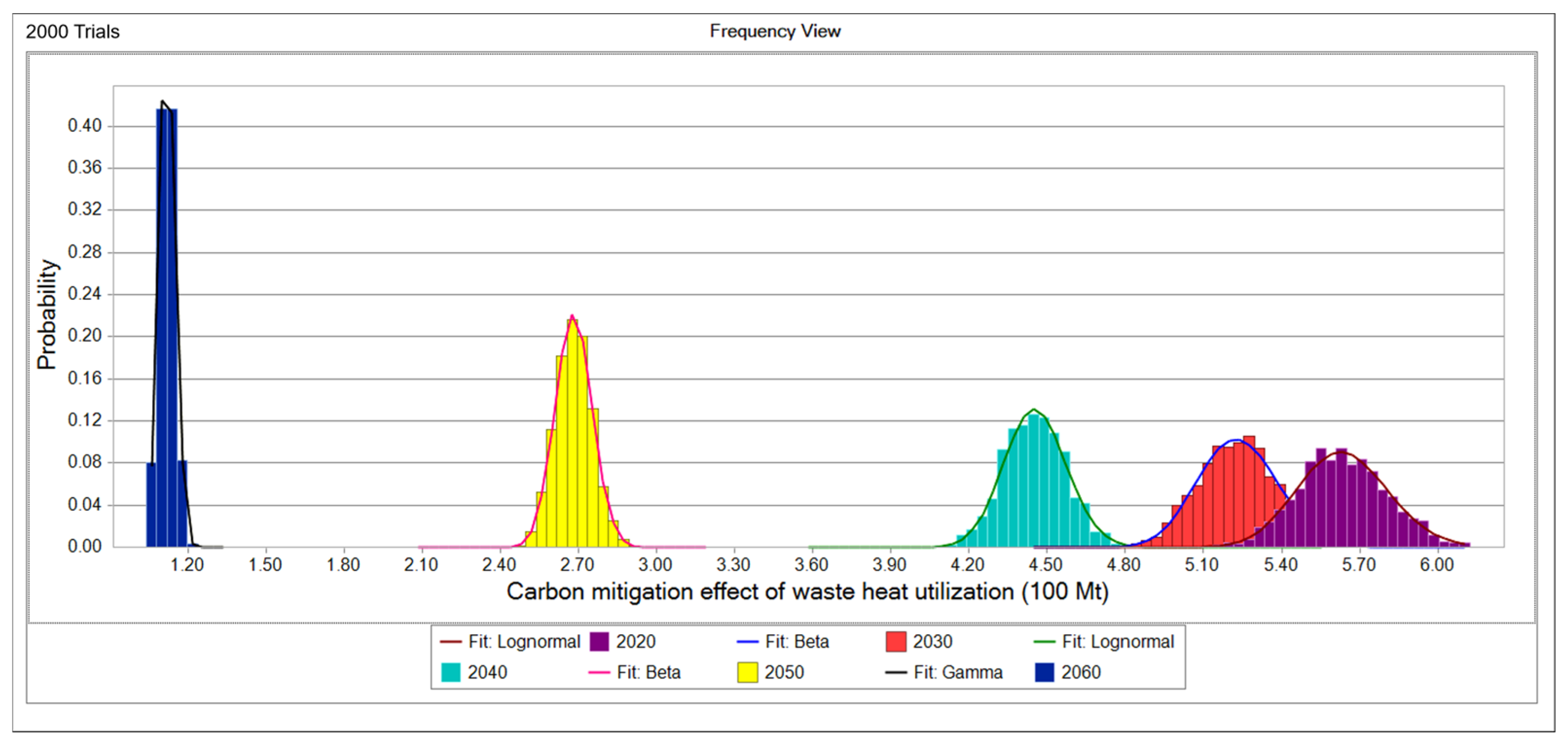 Figure 11. Herein, the horizontal axis represents the carbon reduction volume in each year under the waste heat utilization scenario, while the vertical axis denotes frequency and probability, respectively. It can be observed that as time progresses, the potential of waste heat utilization gradually diminishes, and the uncertainty becomes increasingly smaller. Specifically, the probability distribution of carbon reduction in 2020 exhibits a larger variance, whereas that in 2060 shows a smaller variance. Meanwhile, the variances of the probability distributions from 2020 to 2060 decrease sequentially. Furthermore, the interval between the carbon reduction probability distributions of different years indicates that the carbon reduction effect of waste heat utilization in China is gradually weakening.