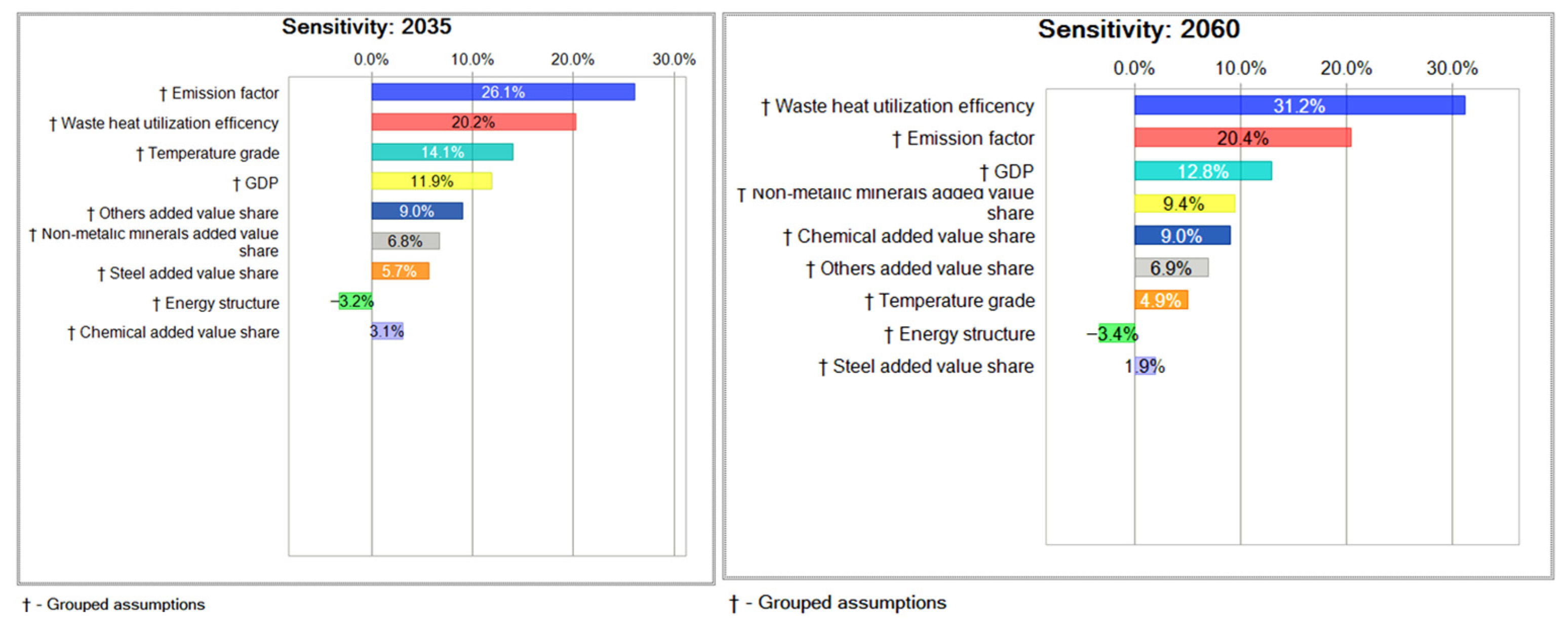 For 2060, the uncertainty is primarily driven by the uncertainty of waste heat utilization efficiency, which has the highest contribution rate of 31.2%. Other sources of uncertainty include emission factors and GDP. It should be noted that energy structure optimization, especially the improvement of electrification level, will reduce the potential of waste heat utilization, thereby weakening the carbon reduction effect of waste heat. The results show that the energy structure reduces the carbon reduction effect by −3.4%.