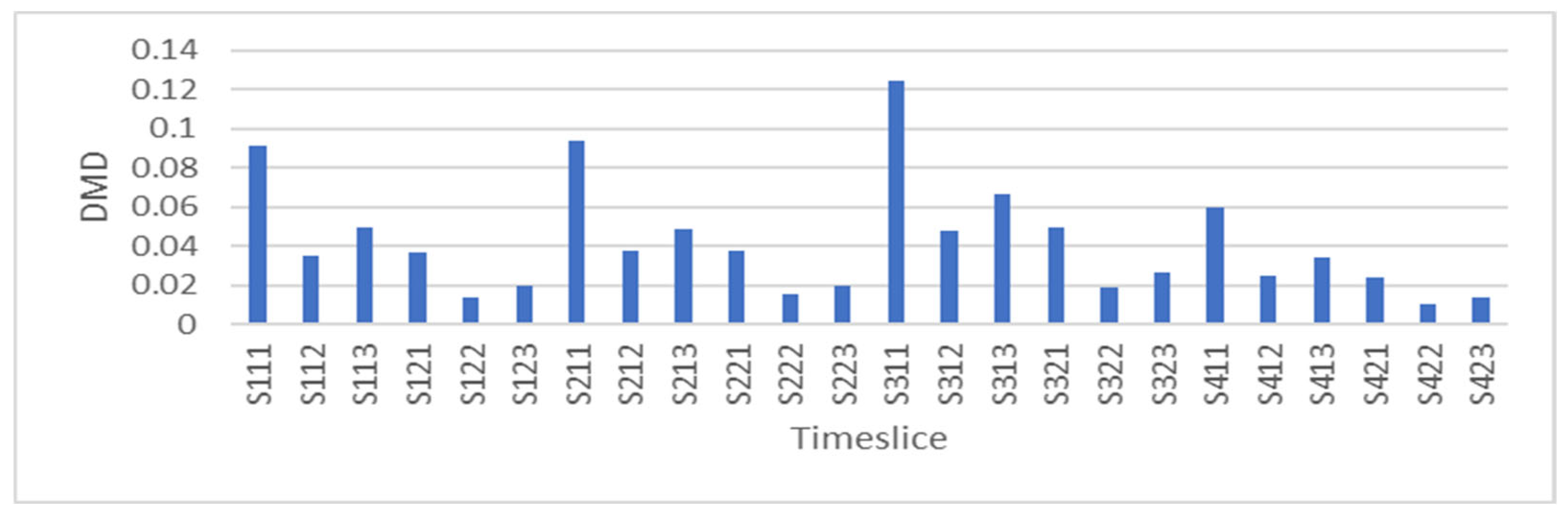 Table 6, for each year, all the defined SpecifiedDemandProfile input values must sum up to 1. The demand profile (DMD) shows the annual fraction of electricity demand that is required in each time slice, which allows the model to capture the temporal variability and shape of energy demand throughout the year, thus aligning energy planning with reality. Visualisation of the variation in the demand profile for each time slice is further illustrated in