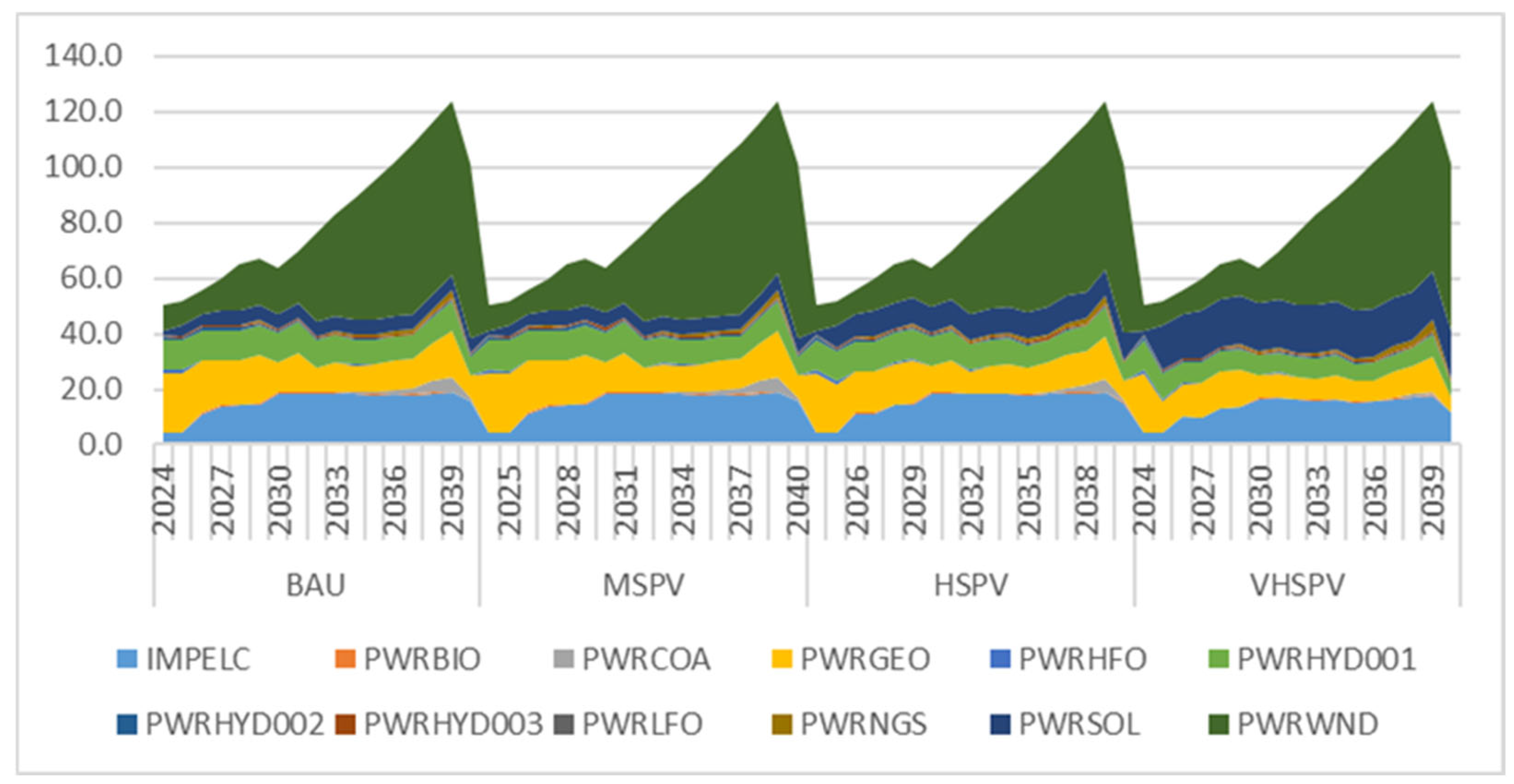 Scenario 3—High-Solar-PV Expansion (HSPV) Scenario: This scenario is also based on the BAU scenario. Solar PV expansion in the capacity mix is constrained to above 20%. The aim is to determine the impact of high-solar-PV expansion on electricity costs.