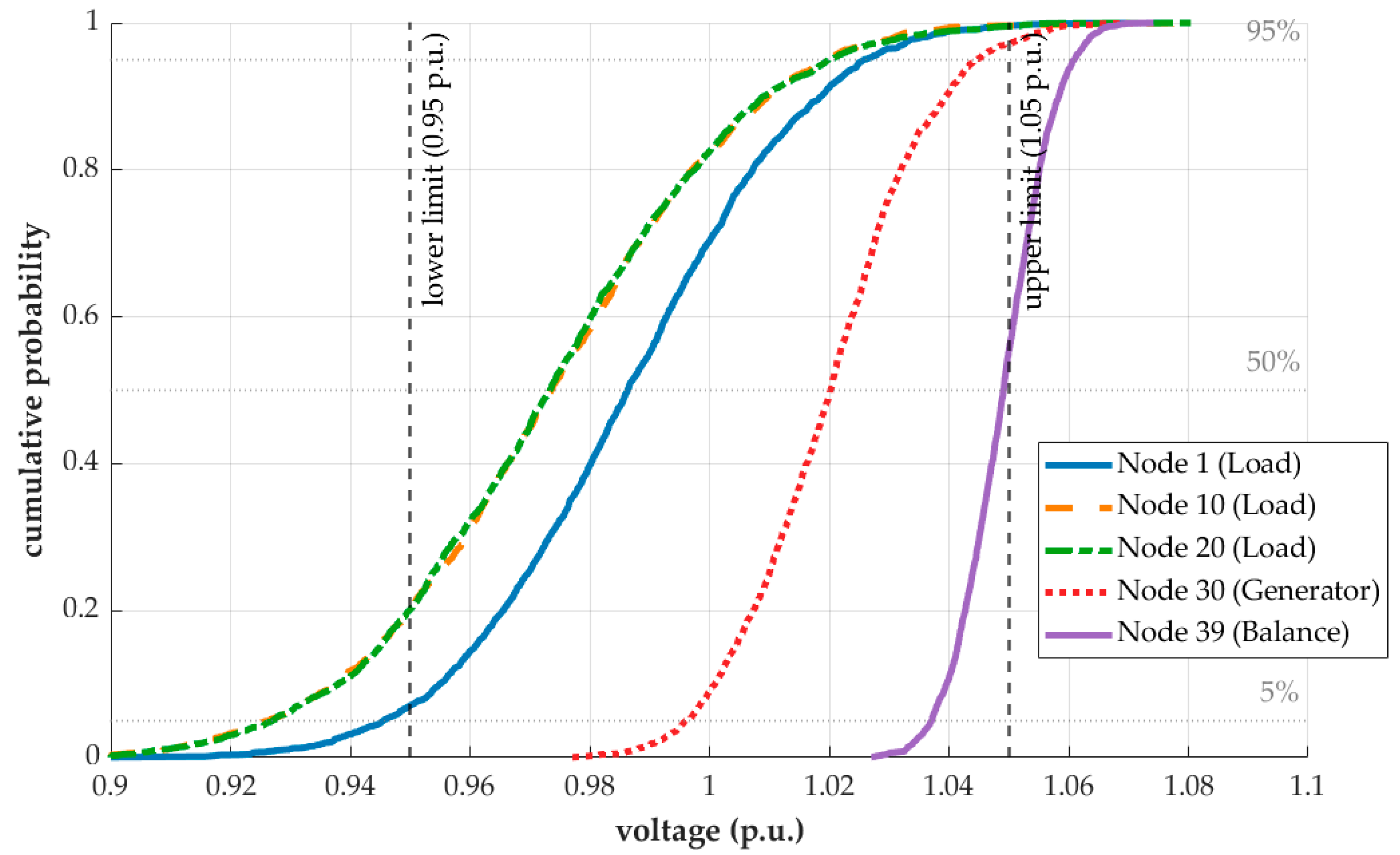 - Voltage operating range: all nodal voltages remain within the nominal range of 0.95–1.05 p.u., without severe voltage violations;