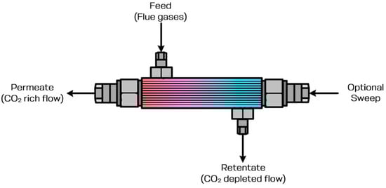 The simulation of the integrated process for capturing carbon dioxide from flue gas was constructed using individual membrane modules interconnected with each other and with auxiliary process units. Each membrane module can operate either in a conventional counter-current configuration or in a sweep-assisted mode, in which the permeate stream is diluted by an external sweep gas. The overall separation process was simulated in Aspen Plus v. 9.0 (Bedford, MA, USA), into which a custom membrane-module block developed in Aspen Custom Modeler was incorporated. This block represents a hollow-fiber membrane module originally designed by Ajayi and Bhattacharyya within the U.S. Department of Energy’s Carbon Capture Simulation Initiative (CCSI) [31].