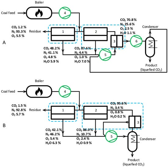 In the configuration (Figure 2A), the permeate streams from modules 1 and 2 are combined upstream of compressor 5 and then fed into membrane module 3. The CO2-rich permeate from module 3 flows to the condenser, where liquid CO2 is recovered. The non-condensed, CO2-lean fraction is subsequently routed to compressor 5. In the configuration (Figure 2B), compressor 5 receives the permeate streams from all membrane modules simultaneously and delivers the combined stream directly to the condenser, where liquid CO2 is obtained. The water is removed sequentially on each compressor unit. In this way, for cascades in Figure 2A,B and two-step counter-flow/sweep processes, the water content reduces in following manner: after the first compression stage, it reduces from 11 to 2.1 mol.%, and then before the condenser it is reduced up to 1.1 mol.%. In the two-step vacuum design, due to the recirculation flow from the permeate side of the second step, the water content does not reduced as efficiently as in previous cases, and this happens as follows: first, compression allows the water content to reduce to 9.4 mol.%, and prior to condensation it reduces to 4.7 mol.%.