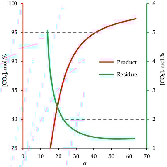 The dependence of carbon dioxide content in product (left red axis) and residue (right green axis) streams on membrane selectivity value at a constant membrane permeance and area. Dotted lines illustrate the target value of CO2 content level.