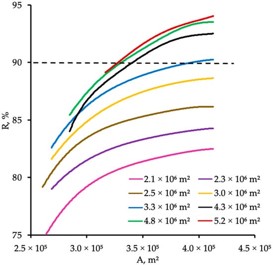 Influence of the membrane area (A) on the carbon dioxide recovery rate (R) in the enrichment section at eight different and constant membrane areas in the stripping section. Dotted lines illustrate the target value of CO2 recovery rate.