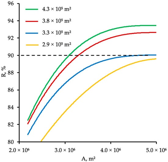 Influence of the membrane area (A) on the carbon dioxide recovery rate (R) in the stripping section at four different and constant membrane areas in the enrichment section. Dotted lines illustrate the target value of CO2 recovery rate.