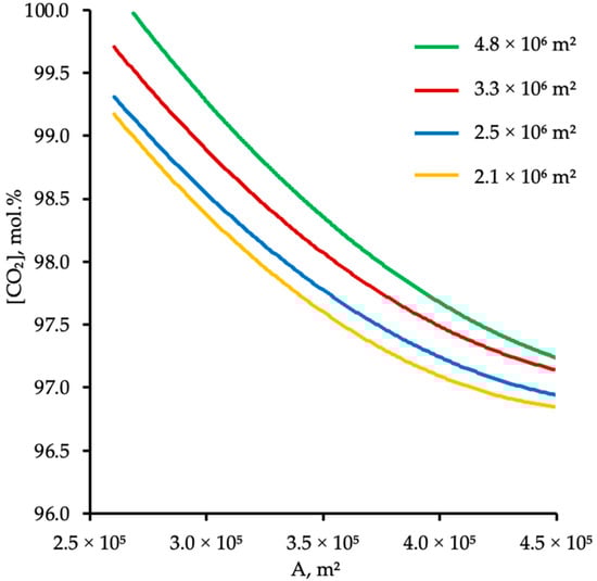 When considering the second key objective of the process—achieving a CO2 purity of 95 mol.% in the product stream—it is important to note that meeting the recovery-rate requirement simultaneously ensures the desired product composition across the entire investigated range of membrane areas. Figure 6 illustrates the effect of the enrichment-section membrane area on CO2 purity in the product stream for several fixed values of the membrane area in the stripping section. As the graphs show, all examined membrane-area combinations yield product streams with CO2 concentrations above 95 mol.%. Even at relatively small membrane areas—2.1 × 106 m2 in the stripping section and approximately 2.6 × 105 m2 in the enrichment section—the target purity is achieved. Moreover, at the lowest membrane-area values tested in both sections, the process produces a product stream containing more than 99 mol.% CO2.