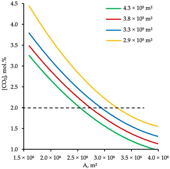 Influence of the membrane area (A) on the carbon dioxide concentration in the residual stream in the stripping section at four different and constant membrane areas in the enrichment section. Dotted lines illustrate the target value of CO2 content level.