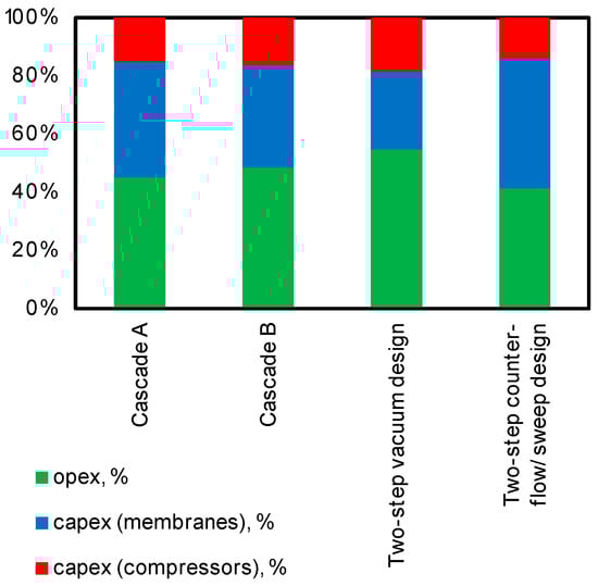The two-step counter-flow/sweep design, by contrast, has the highest CAPEX among all configurations, although its OPEX represent only 41% of the total capture cost. The most balanced performance is observed for membrane Cascade B, in which CAPEX and OPEX contribute 51% and 49% of total costs, respectively.