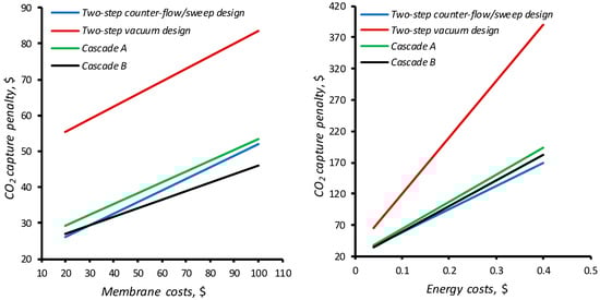 Additionally, sensitivity analysis was performed to evaluate the impact of membrane and energy costs on the overall carbon dioxide capture penalty for all membrane plants under consideration. As is seen from the graphs in Figure 9, all dependencies are linear. It should be noted that, as it was discussed above, the two-step counter-flow/sweep design CO2 capture costs are mostly depends on the CAPEX, and the increase in membrane costs lead to most rapid cost rise; meanwhile, another three configurations are characterized with almost the same cost increase intensity. At the same time, the analysis of energy cost impact highlights the two-step design as the most dependent configuration on this criterion. However, a comprehensive analysis of these relationships reveals that a 5-fold increase in membrane cost leads, at most, to a 2-fold increase in process costs. At the same time, a similar increase in electricity costs leads to a minimum 2.65-fold increase in process costs. Thus, all of the configurations considered are particularly sensitive to rising electricity prices. Moreover, it is possible to evaluate the capture cost ranges in the case of membrane and energy cost increase. Assuming the possible rise up to 20% on both key factors, the capture costs for considered membrane plants are 41.30, 36.43, 69.46, and 39.05 for the proposed membrane cascades (Figure 2A,B), the two-step vacuum design, and the two-step counter-flow/sweep design, respectively.