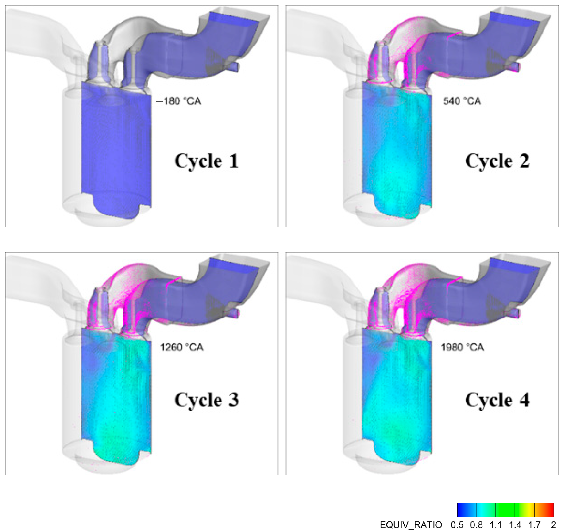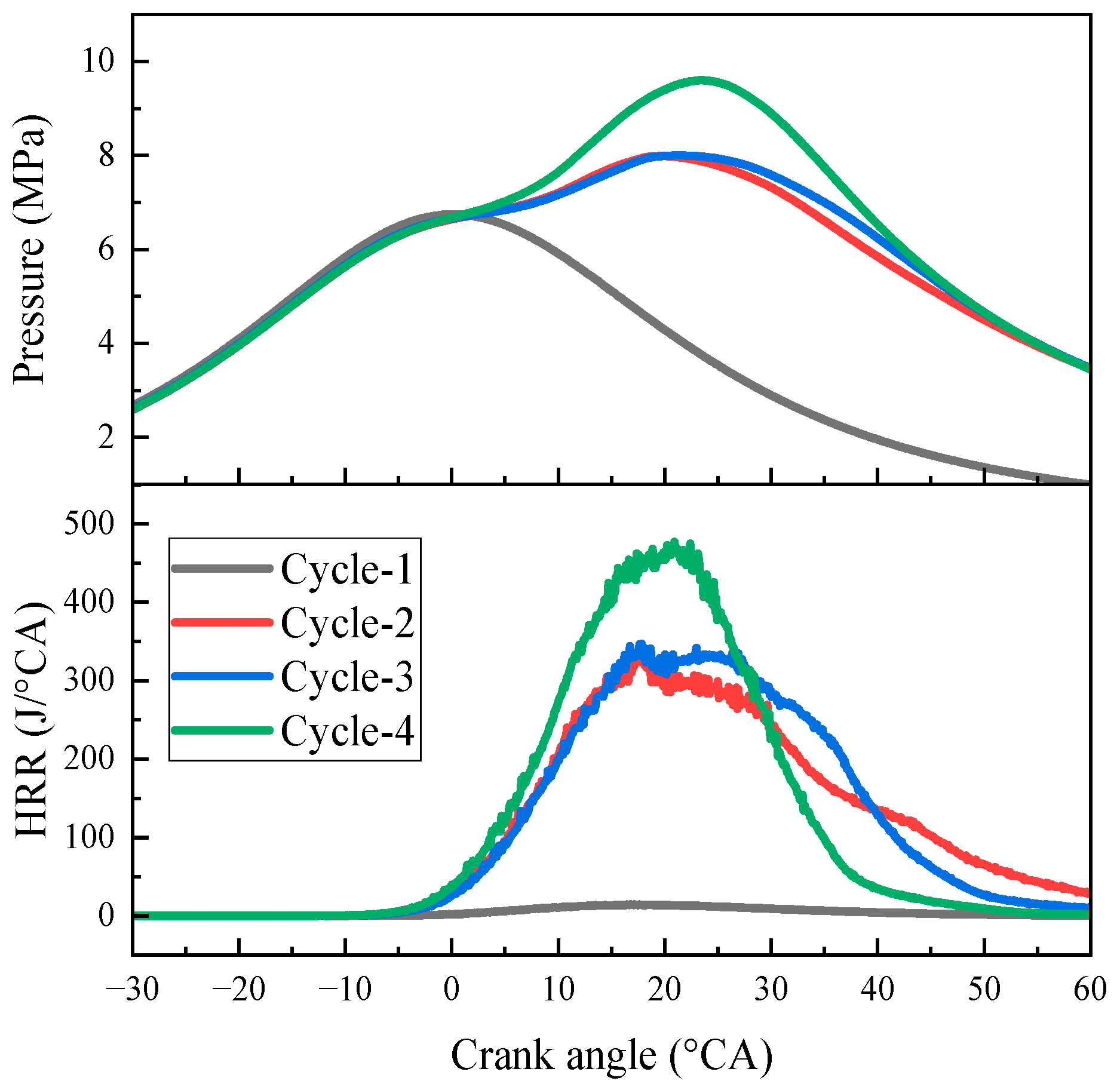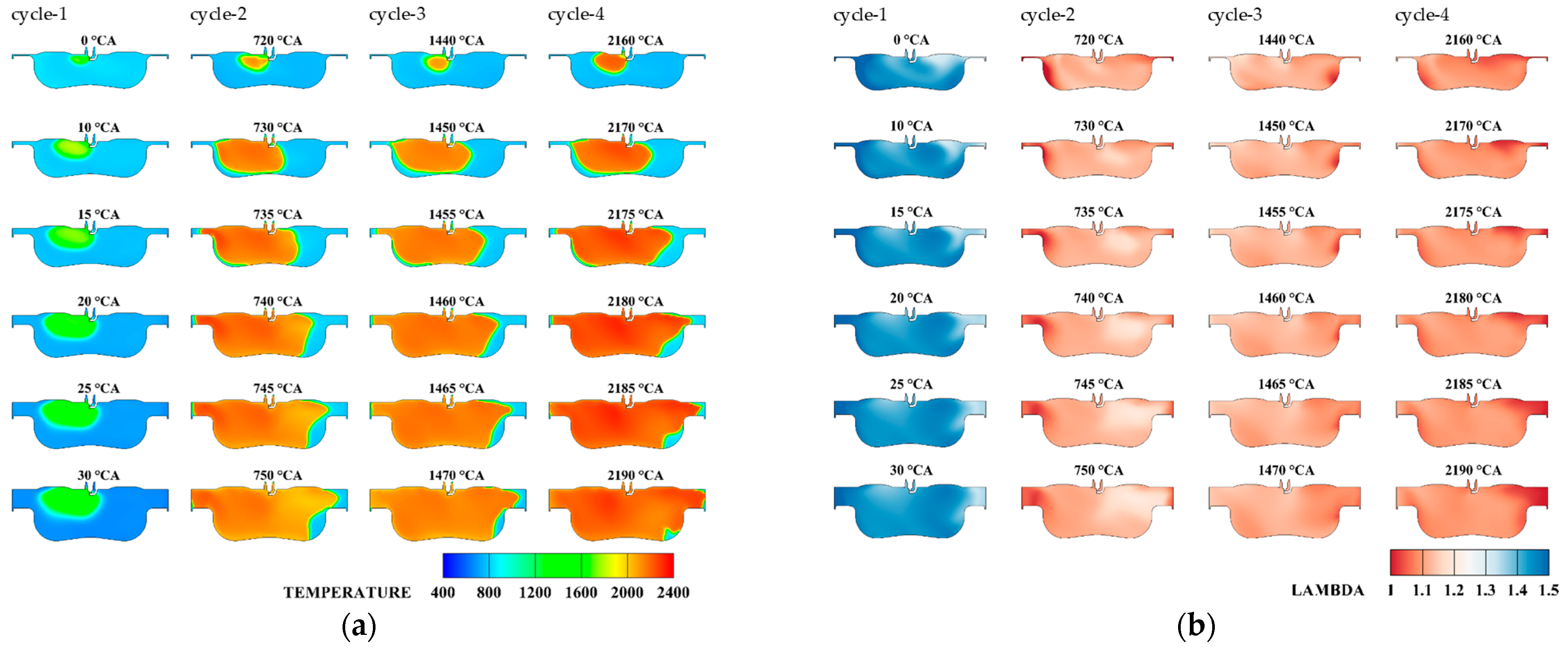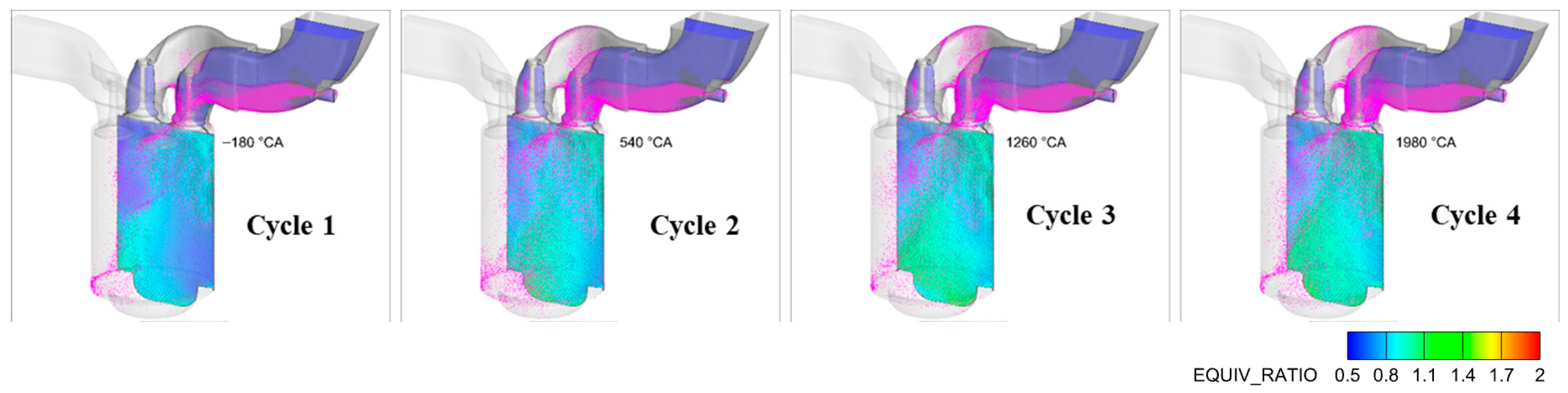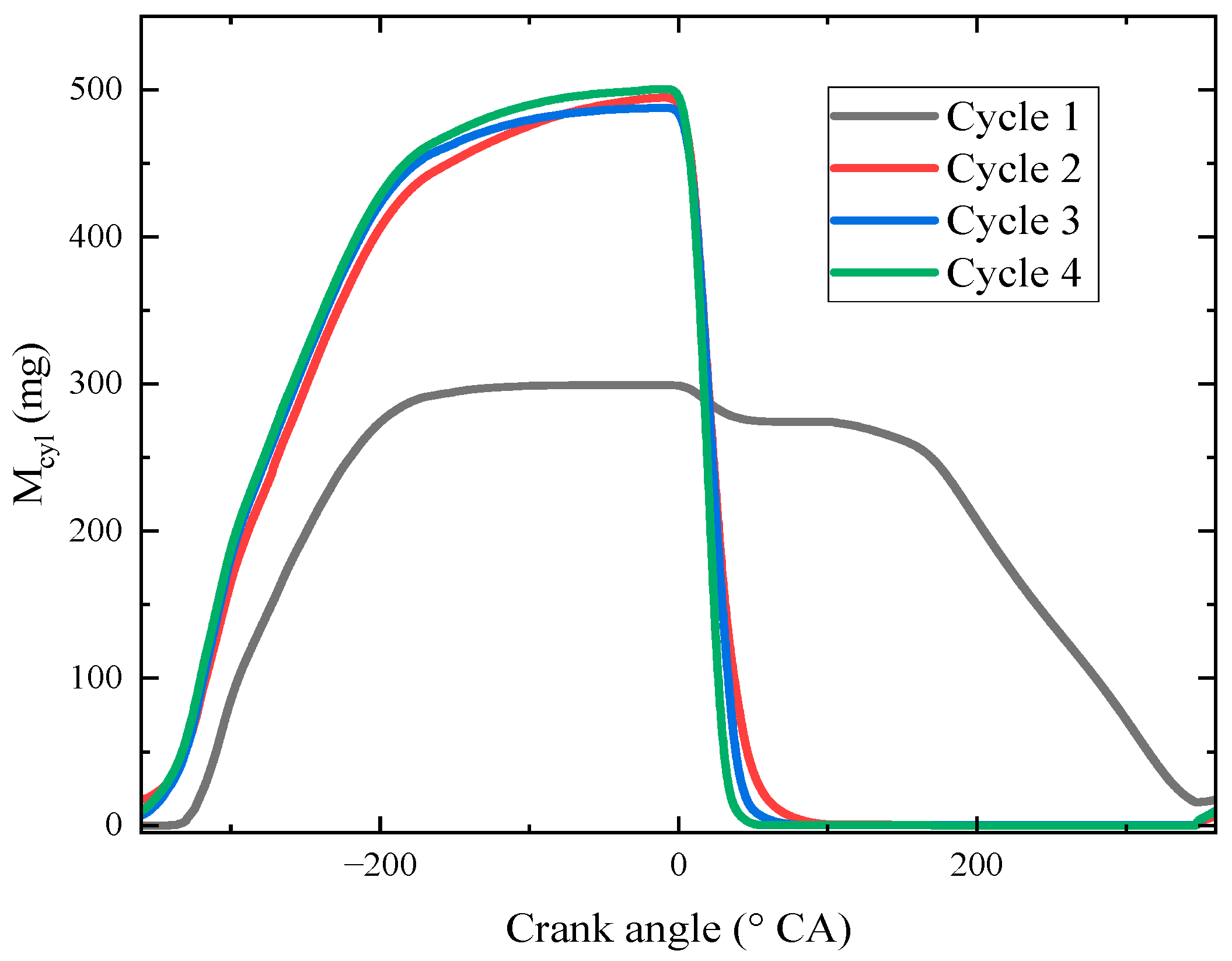3.1. Multi-Cycle Numerical Simulation and Combustion Stabilization Process
