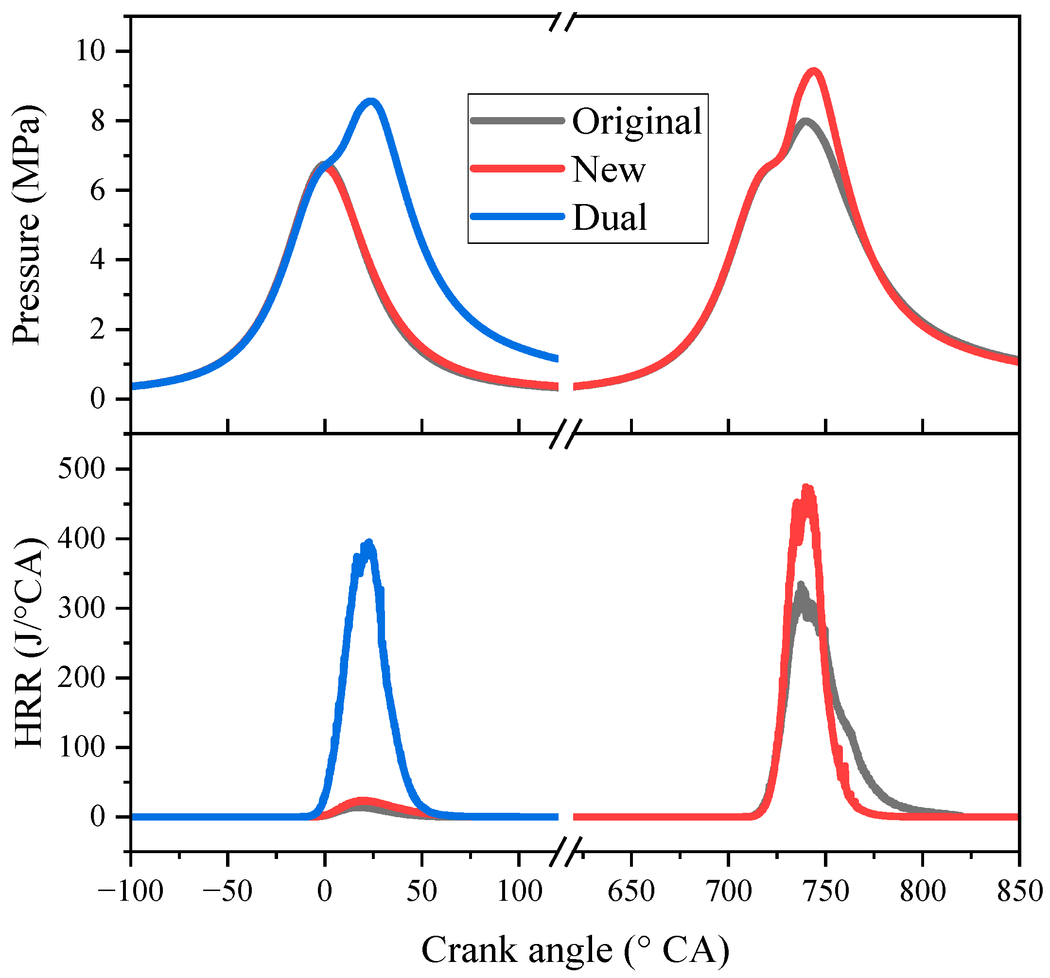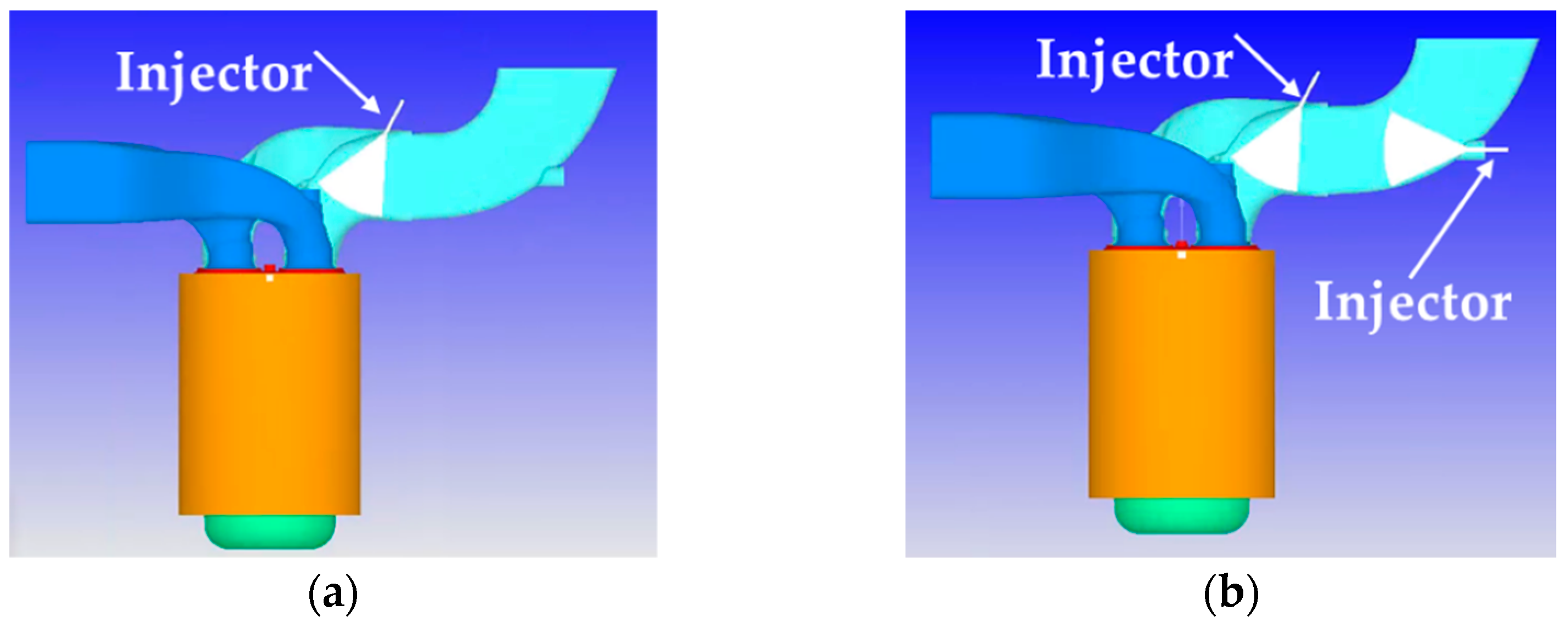 - Wen, H.; Yu, Y.; Li, J.; Xu, C.; Jing, H.; Shen, J. Numerical Investigation on the Influence of Injection Location and Injection Strategy on a High-Pressure Direct Injection Diesel/Methanol Dual-Fuel Engine. Energies 2023, 16, 4518. [Google Scholar] [CrossRef]