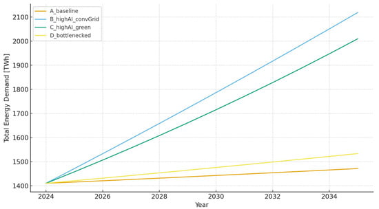 where denotes annual total electricity demand in terawatt-hours (TWh) and represents the carbon intensity of the energy mix (kg CO2/kWh). The multiplication yields total annual emissions in megatonnes of CO2 (Mt CO2). The emission factor declines proportionally to the renewable share in each scenario. The model uses a global average of 0.45 kg CO2/kWh as a starting point. All equations are implemented in Python as a deterministic year-by-year computation. Parameters such as adoption rates, growth factors, and efficiency gains are linearly interpolated between 2024 and 2035. The framework allows rapid scenario testing and sensitivity analysis by varying assumptions (e.g., AI adoption speed, PUE improvement, renewable share). This model deliberately abstracts from market prices and feedback loops to isolate physical and technological effects. While simplified, it provides a transparent structure for further refinement—linking AI scaling, digital energy demand, and emission outcomes in a quantifiable manner. Total energy demand and carbon emissions evolve differently across the four simulated scenarios (Figure 2 and Figure 3). The results quantify how the interaction between AI deployment intensity, energy efficiency, and renewable integration shapes overall system performance in logistics.