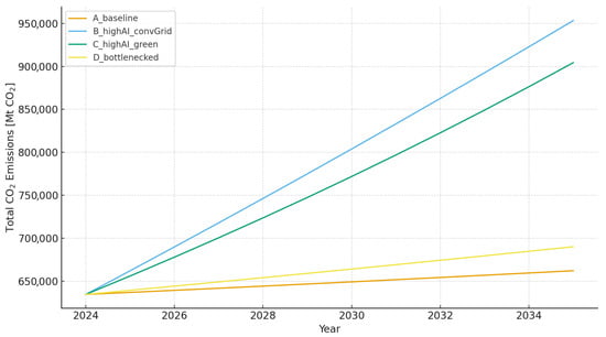 Figure 2 shows that total energy demand increases under all pathways, but the slope and curvature differ markedly. Figure 3 mirrors these dynamics for emissions. Scenarios A and D follow relatively stable CO2 trajectories, while Scenario B generates the highest cumulative emissions—an outcome of high data-center load combined with fossil-dominated power. In contrast, Scenario C demonstrates the potential for decoupling digital expansion from emission growth, yielding a substantially flatter CO2 curve as renewable generation and AI-based optimization reduce the effective emission factor.