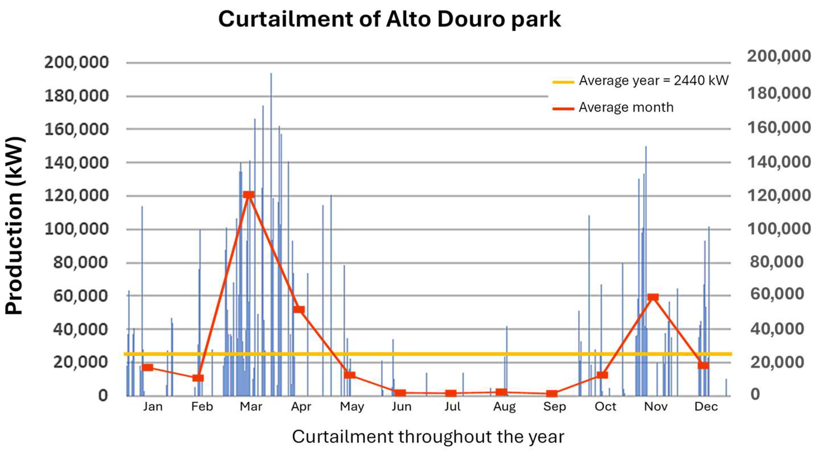 | Time | Armamar | Armamar II | Serra da Nave | Testos II | Chavães | Serra de Sampaio Ranhados | Sendim | Overproduction Equipment 43 MW | Hybridization 180 MW | Total | Curtailment [kWh] |