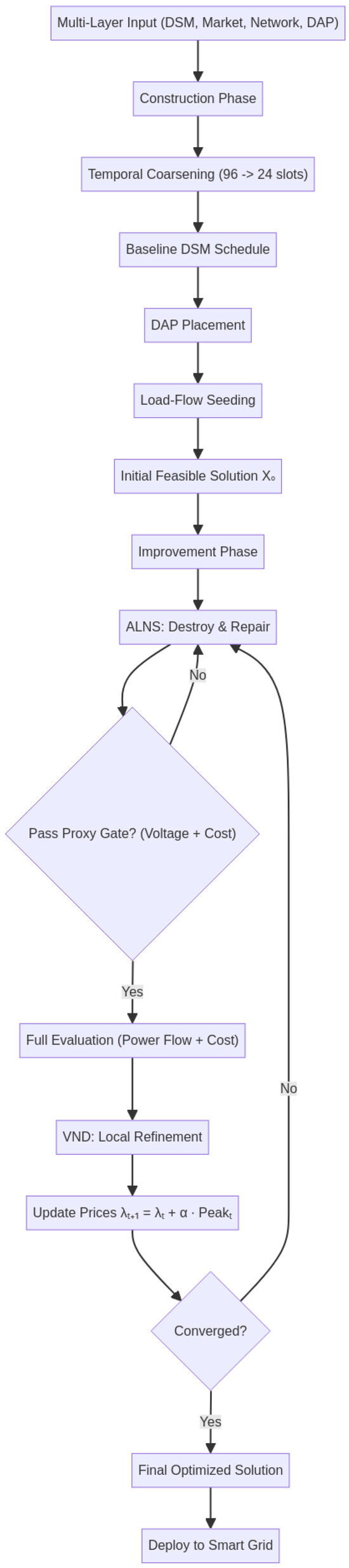 This study proposed H-EMOS-Lite, an adaptive multi-layer heuristic framework that jointly optimizes demand-side management (DSM) scheduling, dynamic aggregator pricing, data aggregator placement (DAP), and AC load-flow feasibility within a unified real-time loop. Unlike conventional single-layer or sequential approaches—which often produce infeasible or distorted load profiles—H-EMOS-Lite ensures anytime feasibility and cross-layer consistency through a construct–improve heuristic enhanced by proxy-gated evaluation.